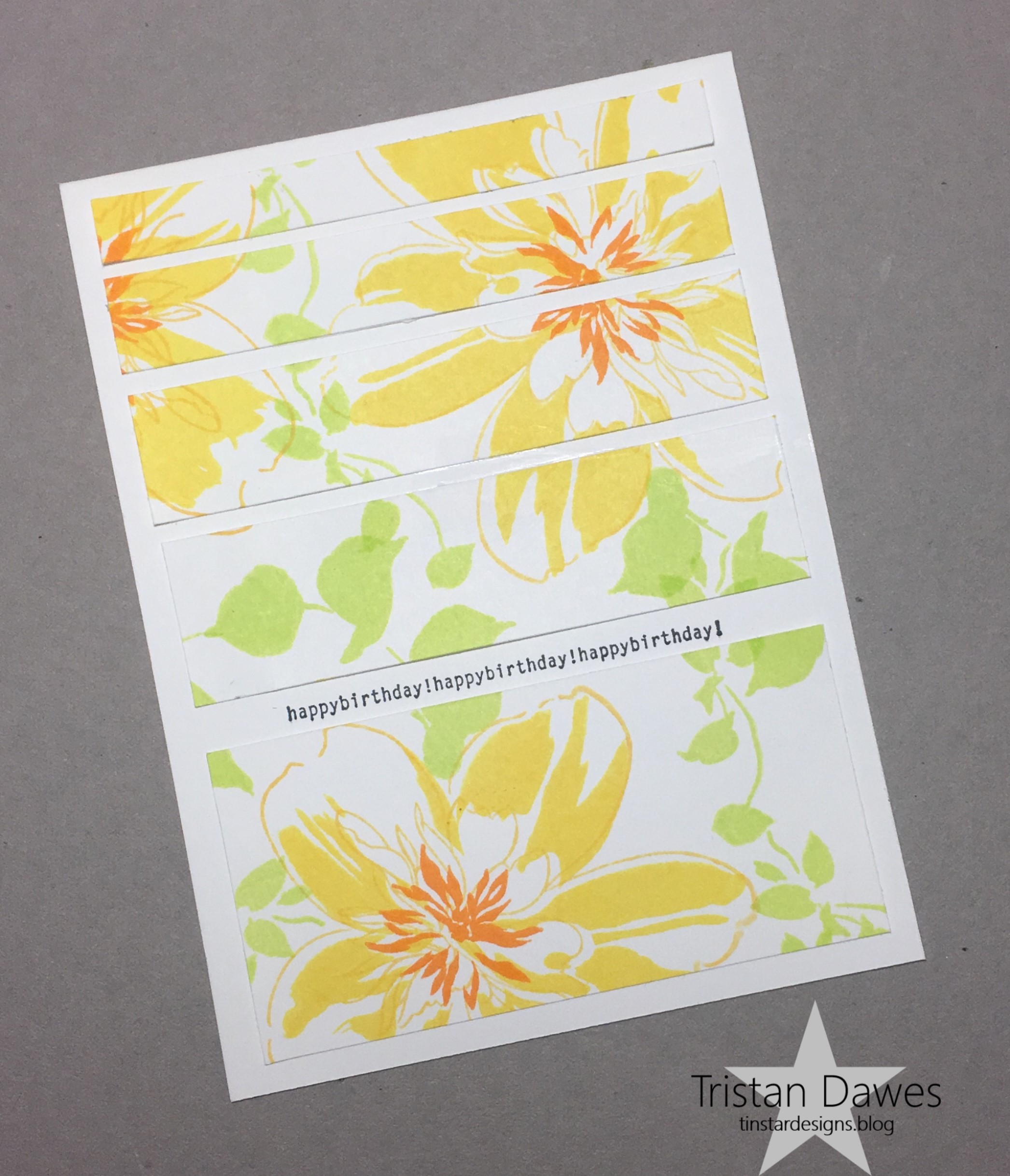 I loved the colour scheme in the Card Concept inspiration photo and the background panels in Just Add Ink, so when I stamped my card I focussed on yellows and green and then cut my panel up and separated them to mimic the grout and added the birthday sentiment in one of the gaps.