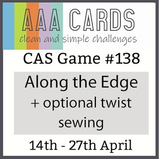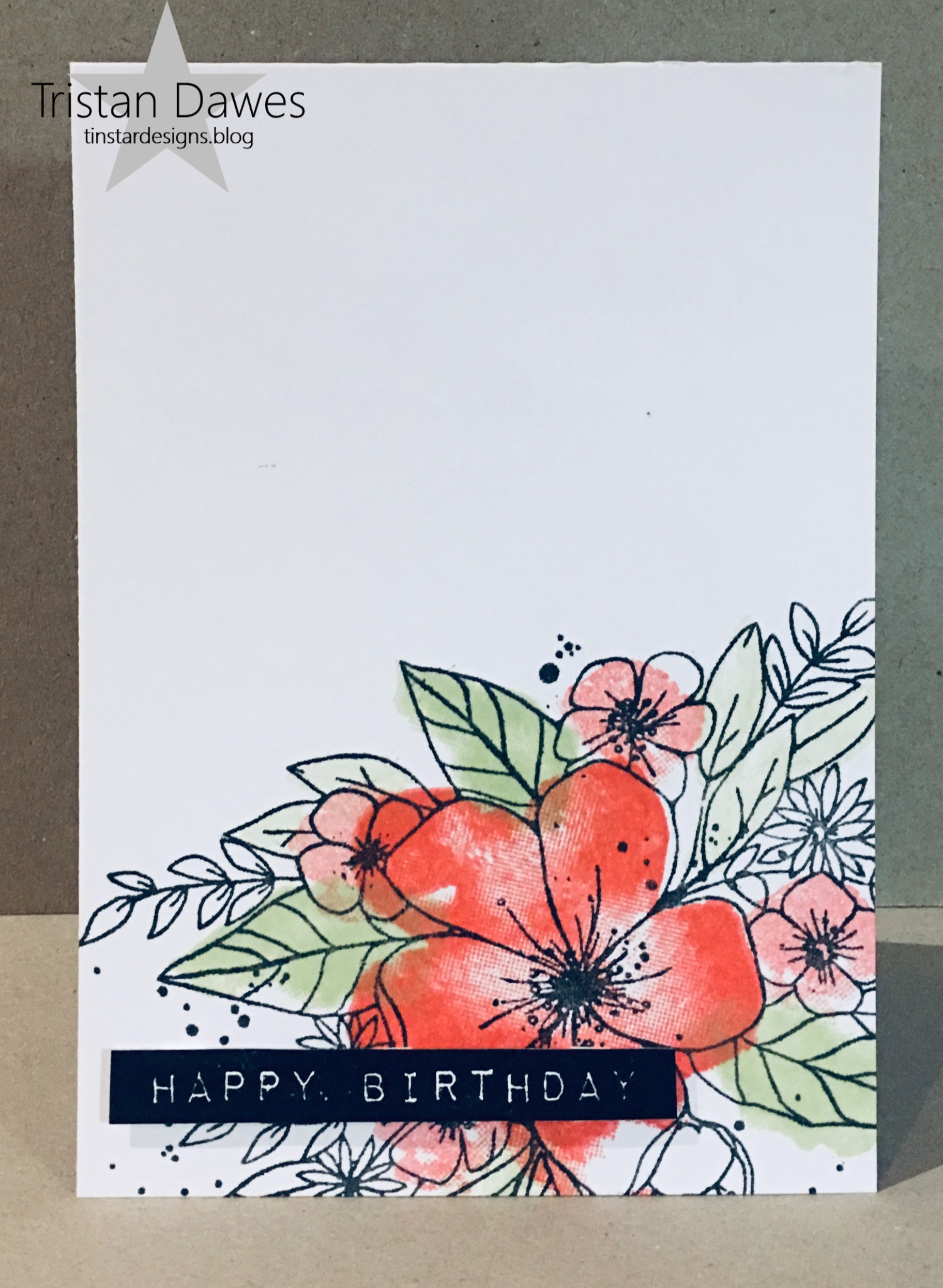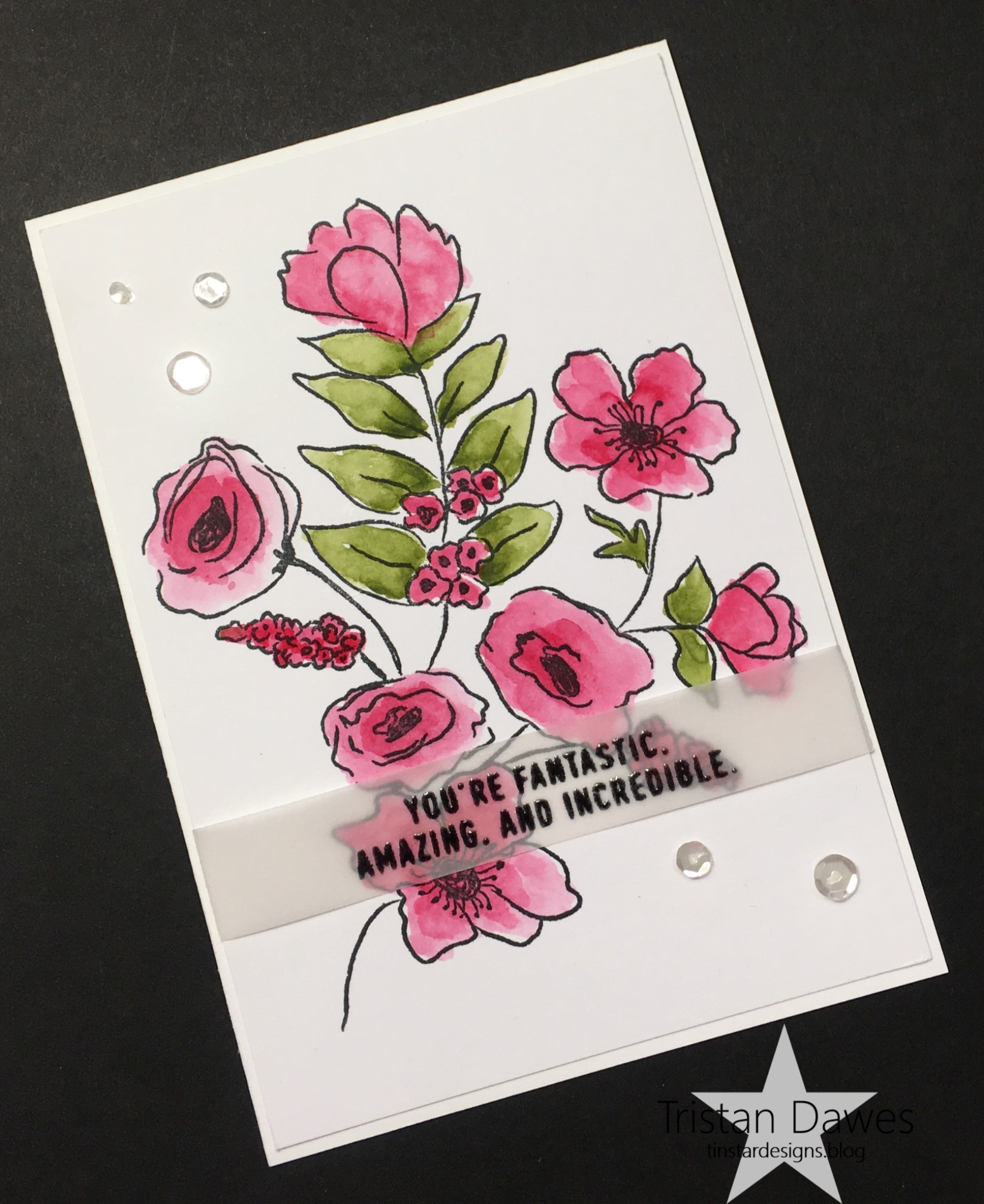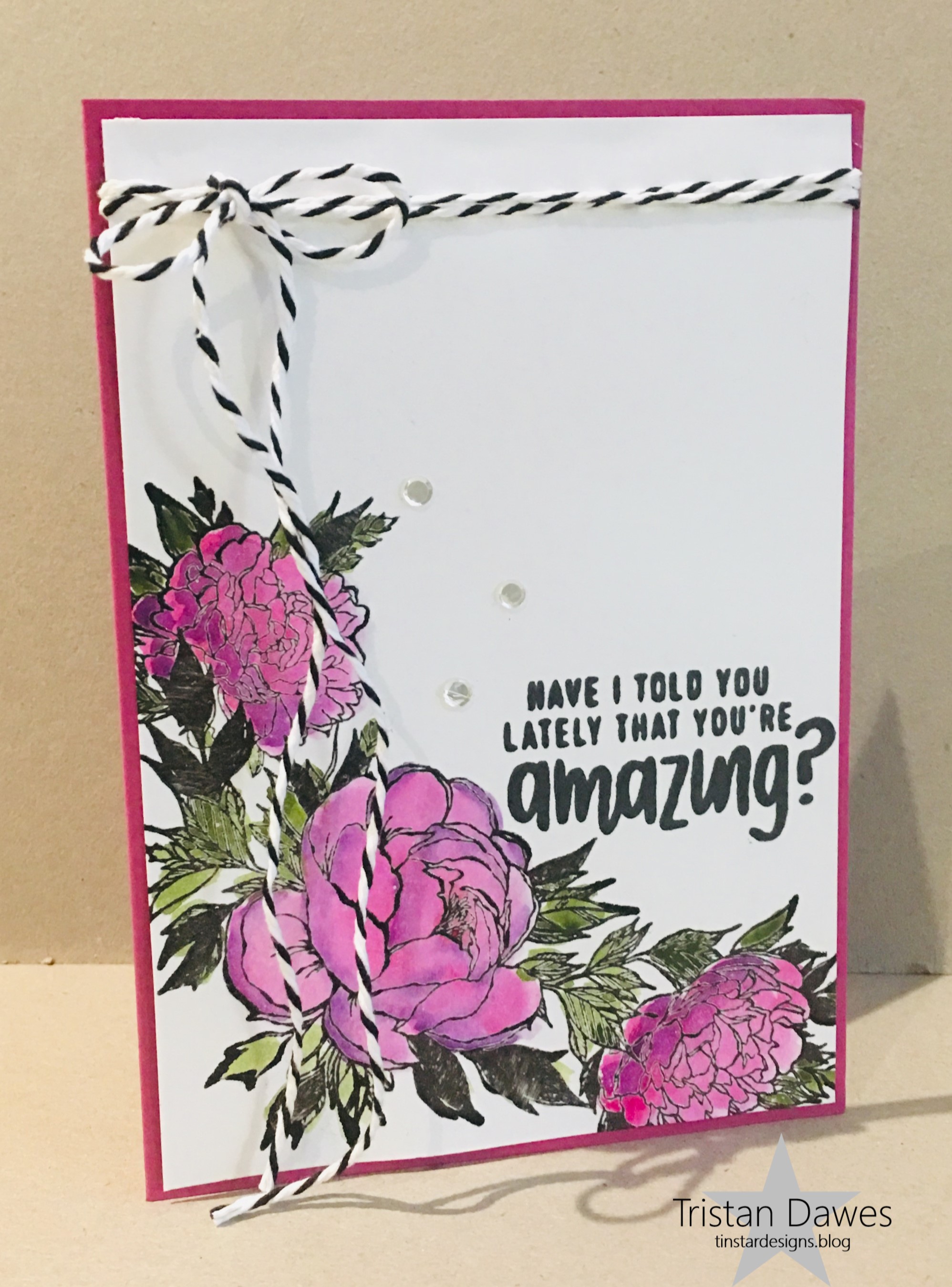 I chose along the bottom and left edge for my card layout (no sewing though!). The floral set is probably from Altenew which I borrowed from my friend Michelle and the sentiment is from Simon Says Stamp ‘Amazing’. I water coloured the flowers then added some twine and sequins for the finishing effect.