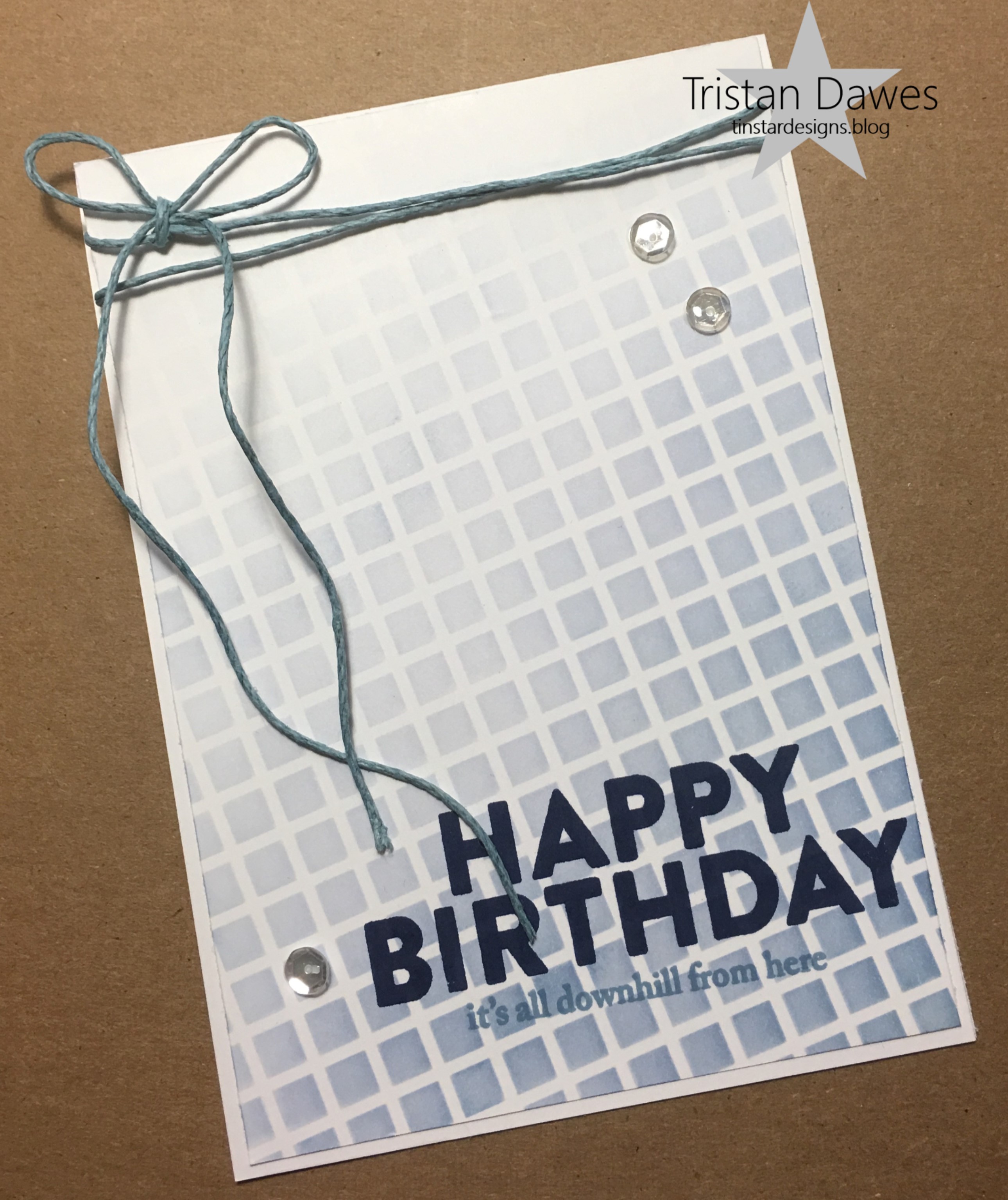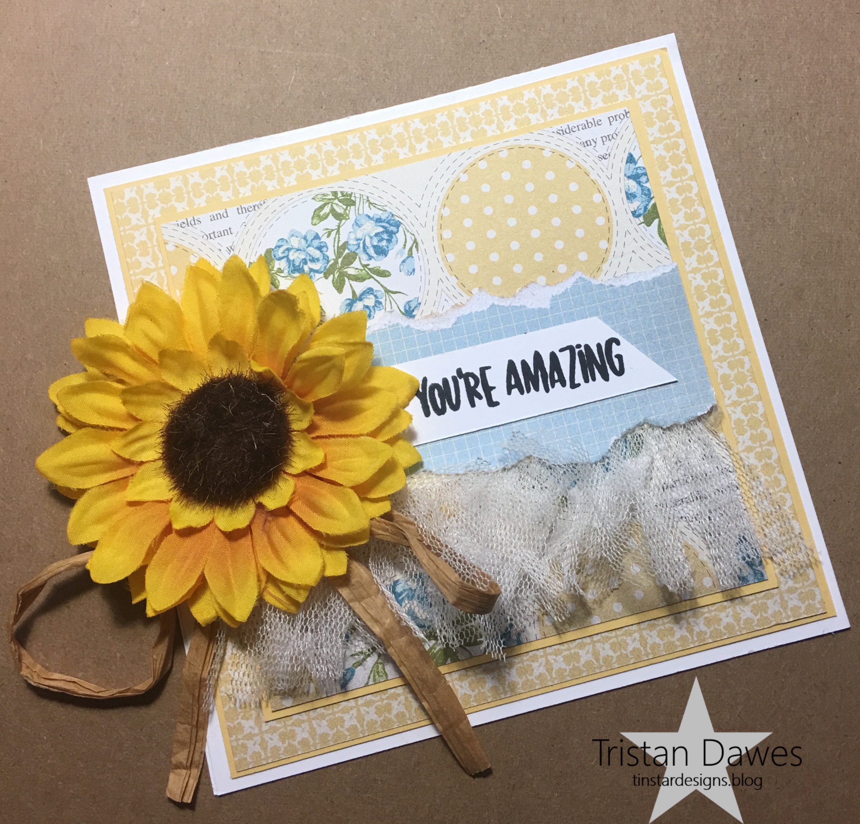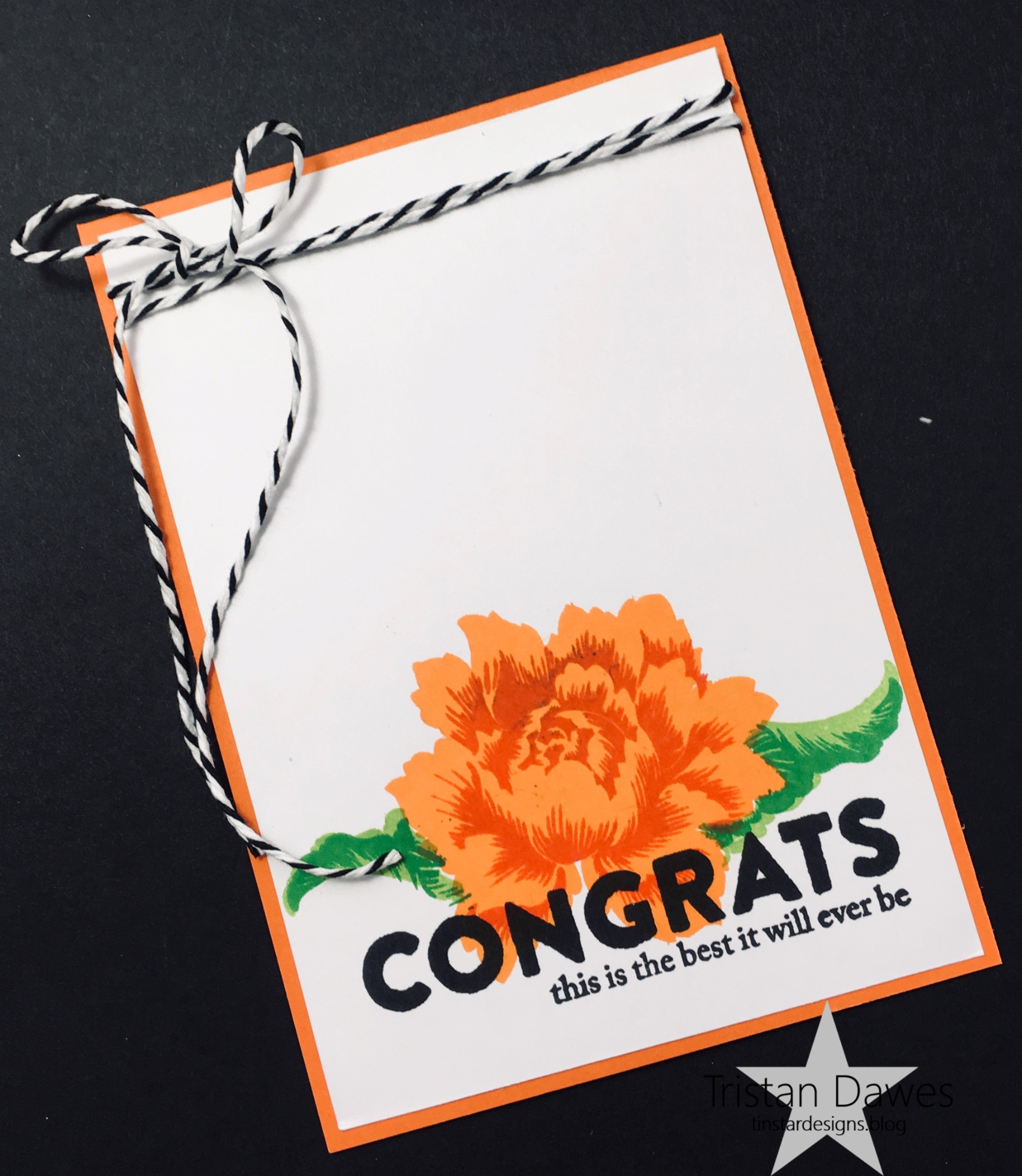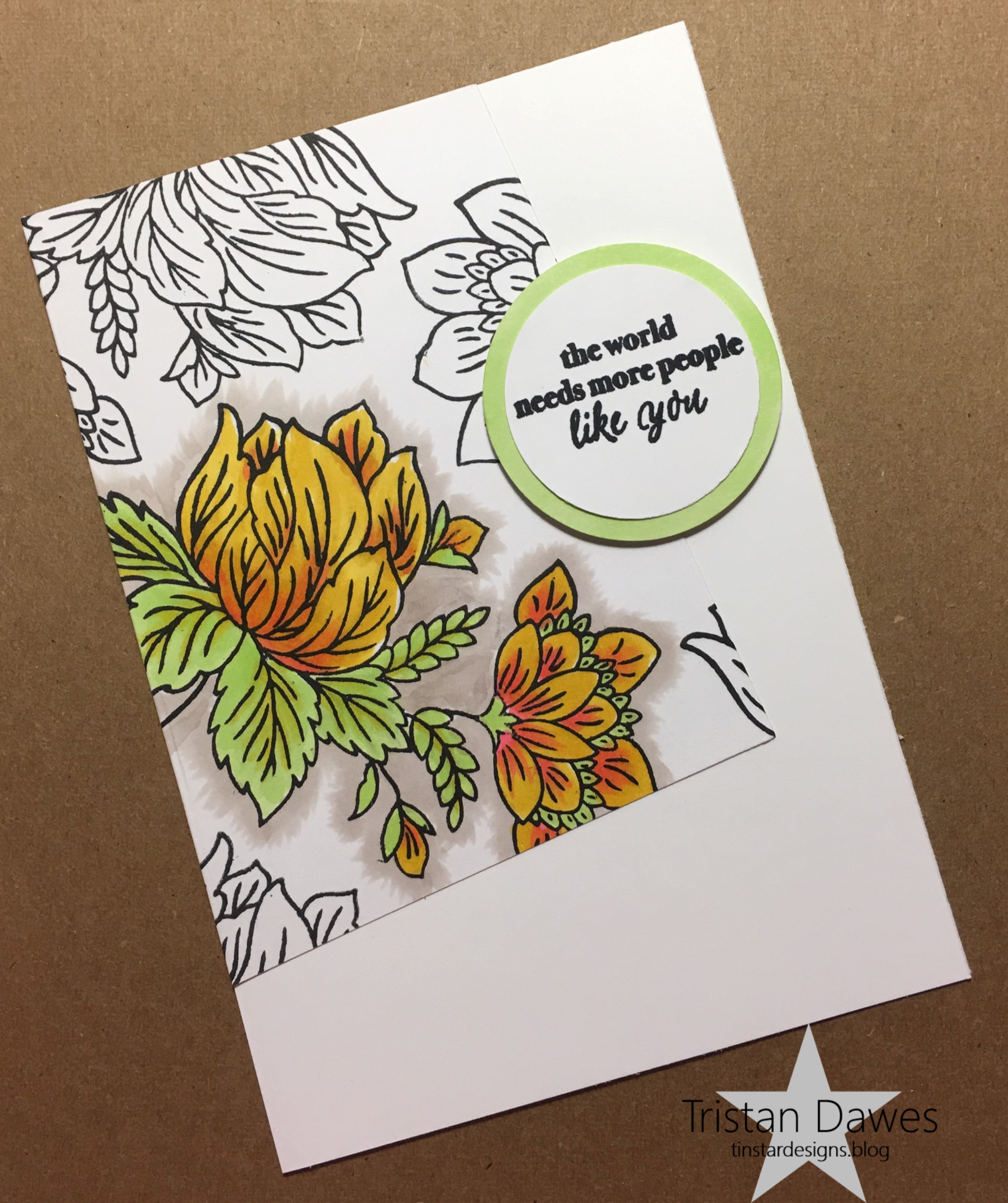 I chose along the bottom and left edge for my card layout (no sewing though!). The floral set is probably from Altenew which I borrowed from my friend Michelle and the sentiment is from Simon Says Stamp ‘Amazing’. I water coloured the flowers then added some twine and sequins for the finishing effect.