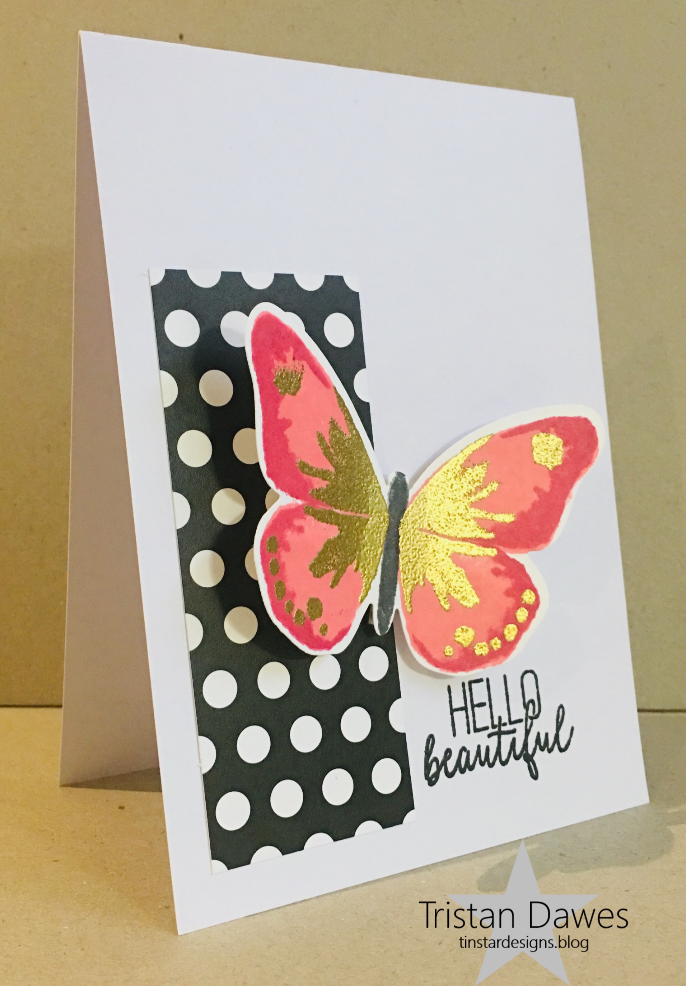 I stamped and die cut the butterfly with Stampin Up ‘Watercolor wings’, used some black and white polka dot DSP from Catherine Pooler Designs and a sentiment from Stampin Up ‘Butterfly gala’ for this super quick and CAS card. Don’t you love the gold on the wings?