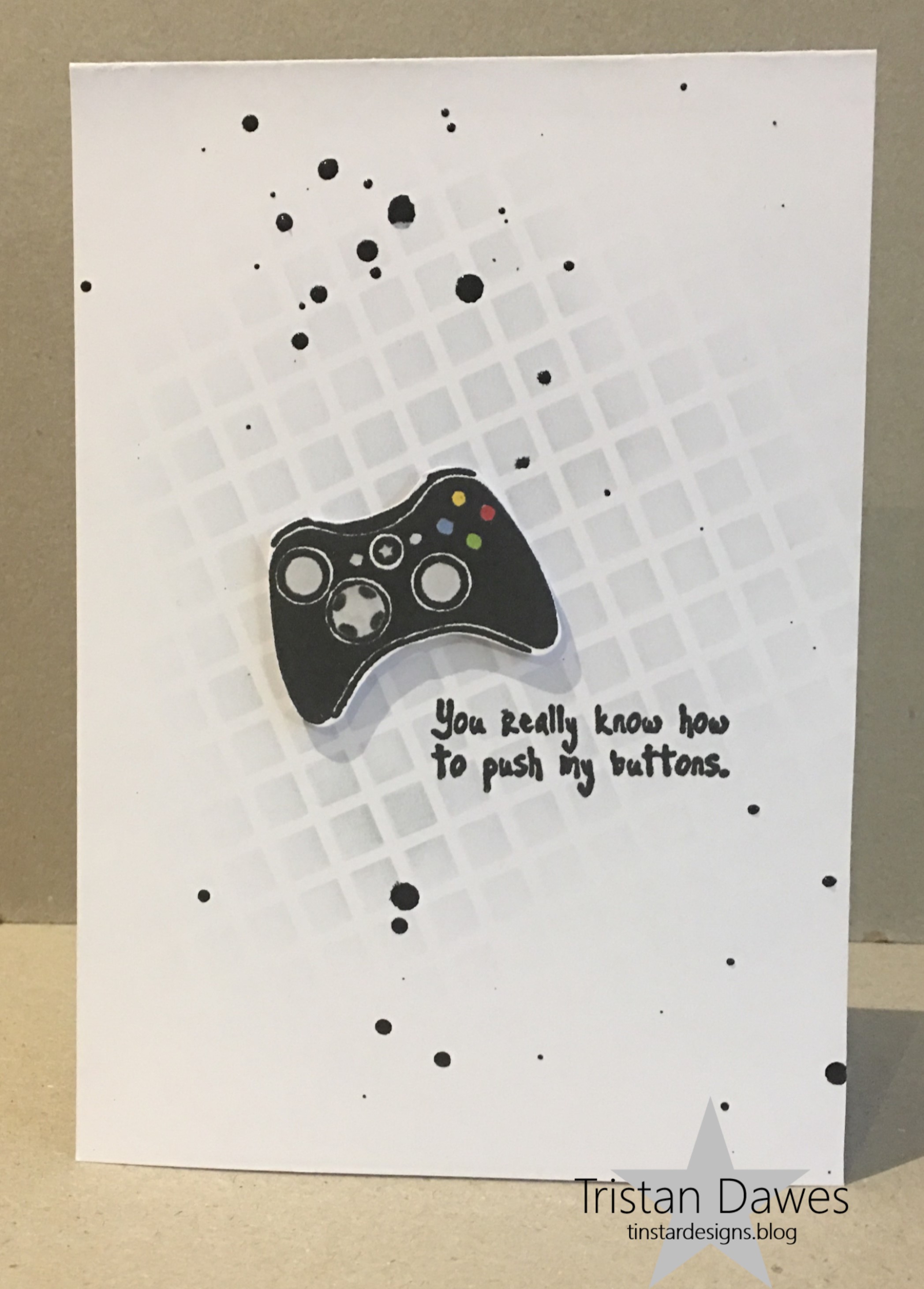 I created a card for my ‘nerdy gamer’ hubby. I used a stamp set from Pretty Cute Stamps called ‘Game on’ (this set has some great snarky sentiments in it) and the Altenew cube stencil. I added a few ink splatters to finish of this card. This will go into my stash for next Valentines Day!