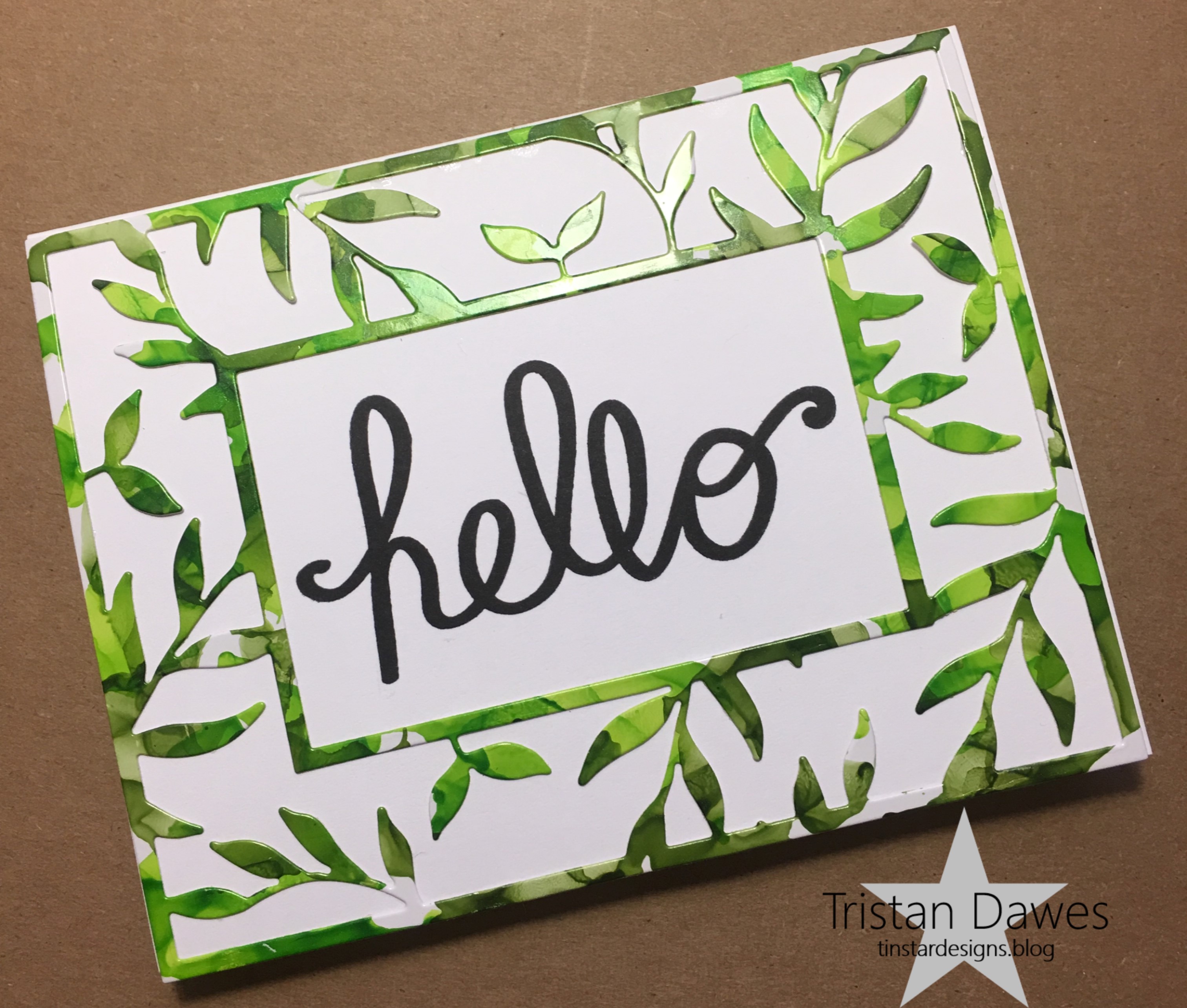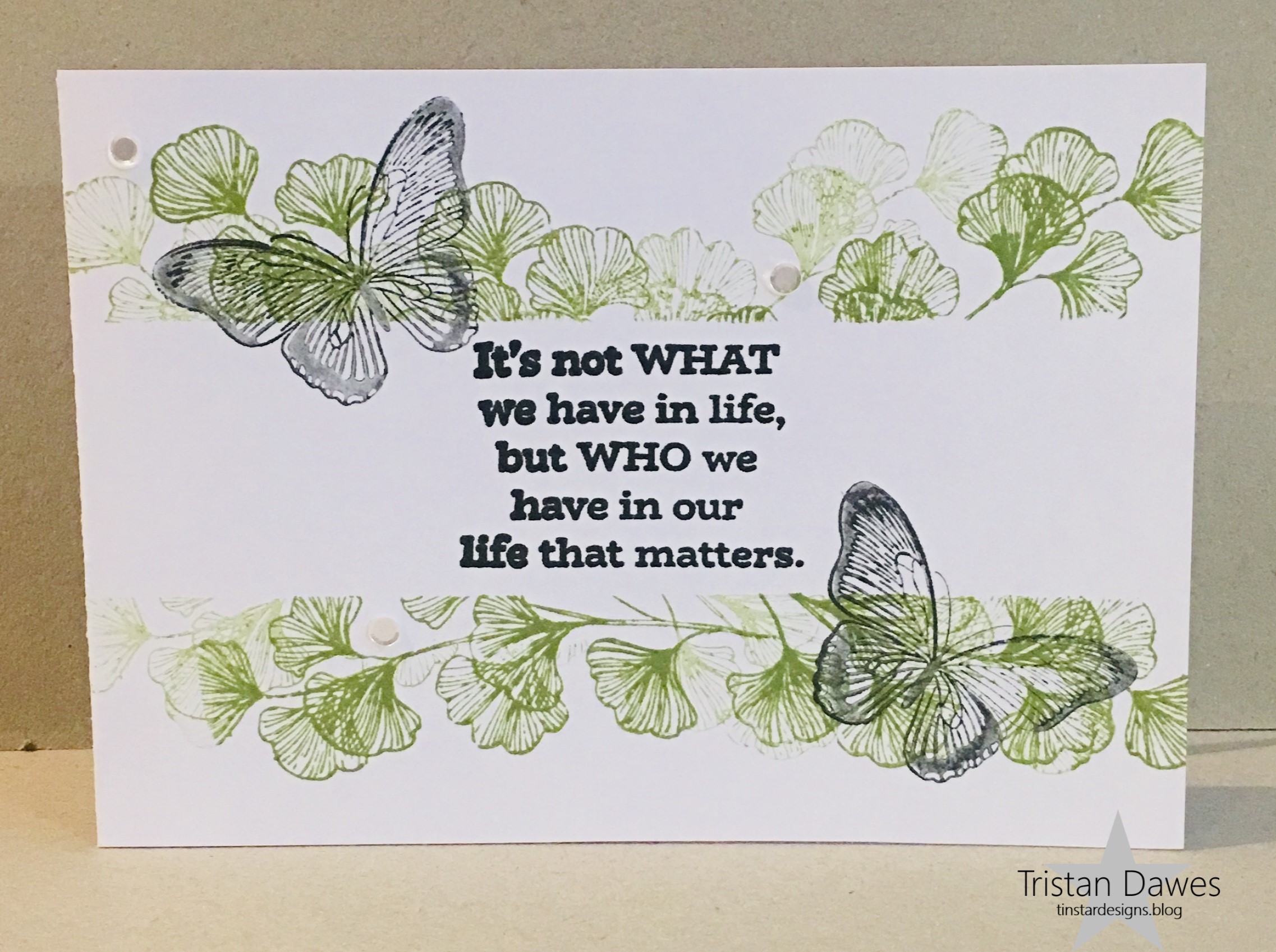 I flipped the sketch on it’s side, masked of the centre panel then stamped one of the leaves from the Kaisercraft ‘Whisper’ stamp set in Catherine Pooler Designs eucalypus ink – I did some double stamping without reinking to give some depth. I then stamped the butterfly and sentiment in black ink; added a couple of sequins and this OLC was done.