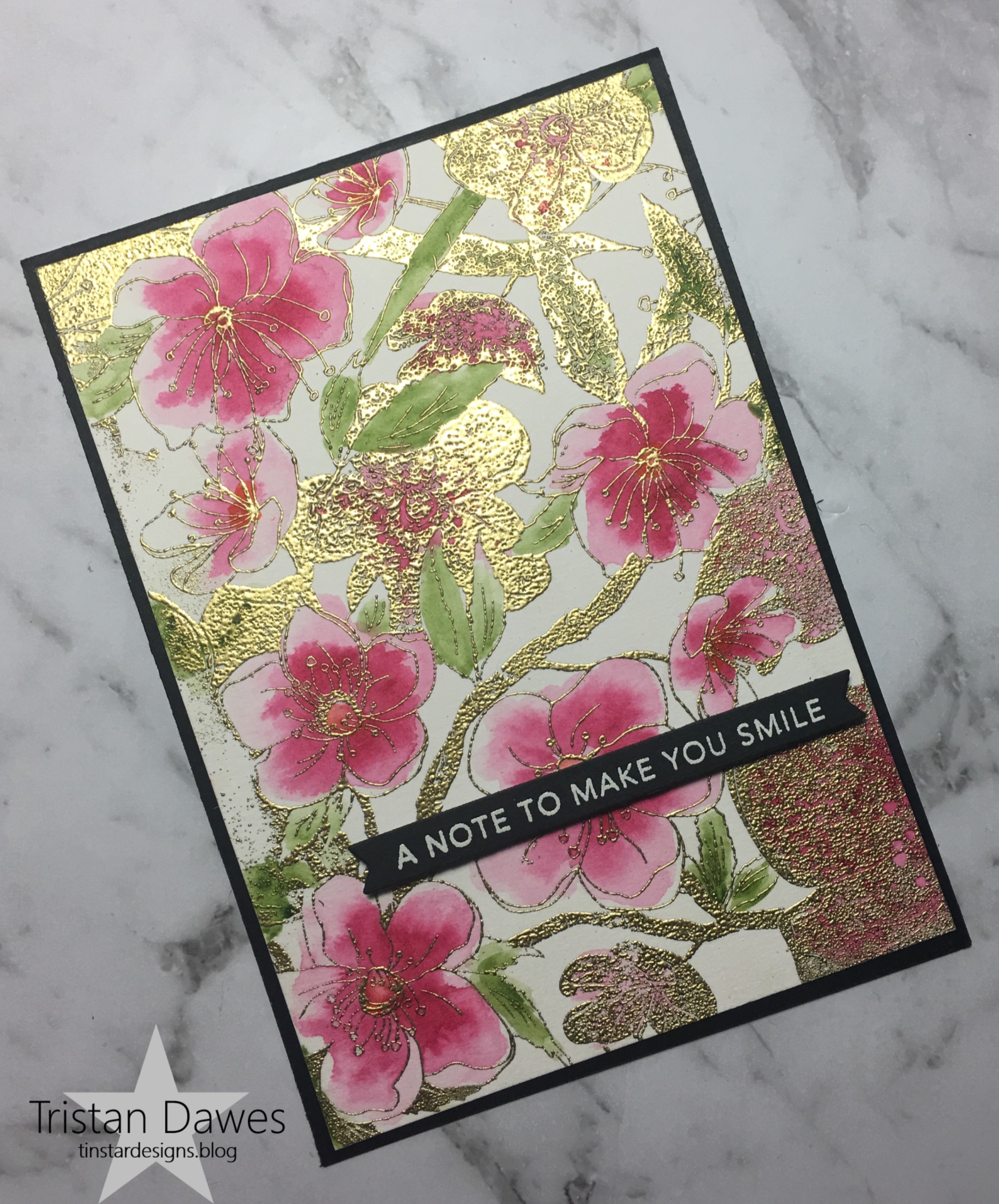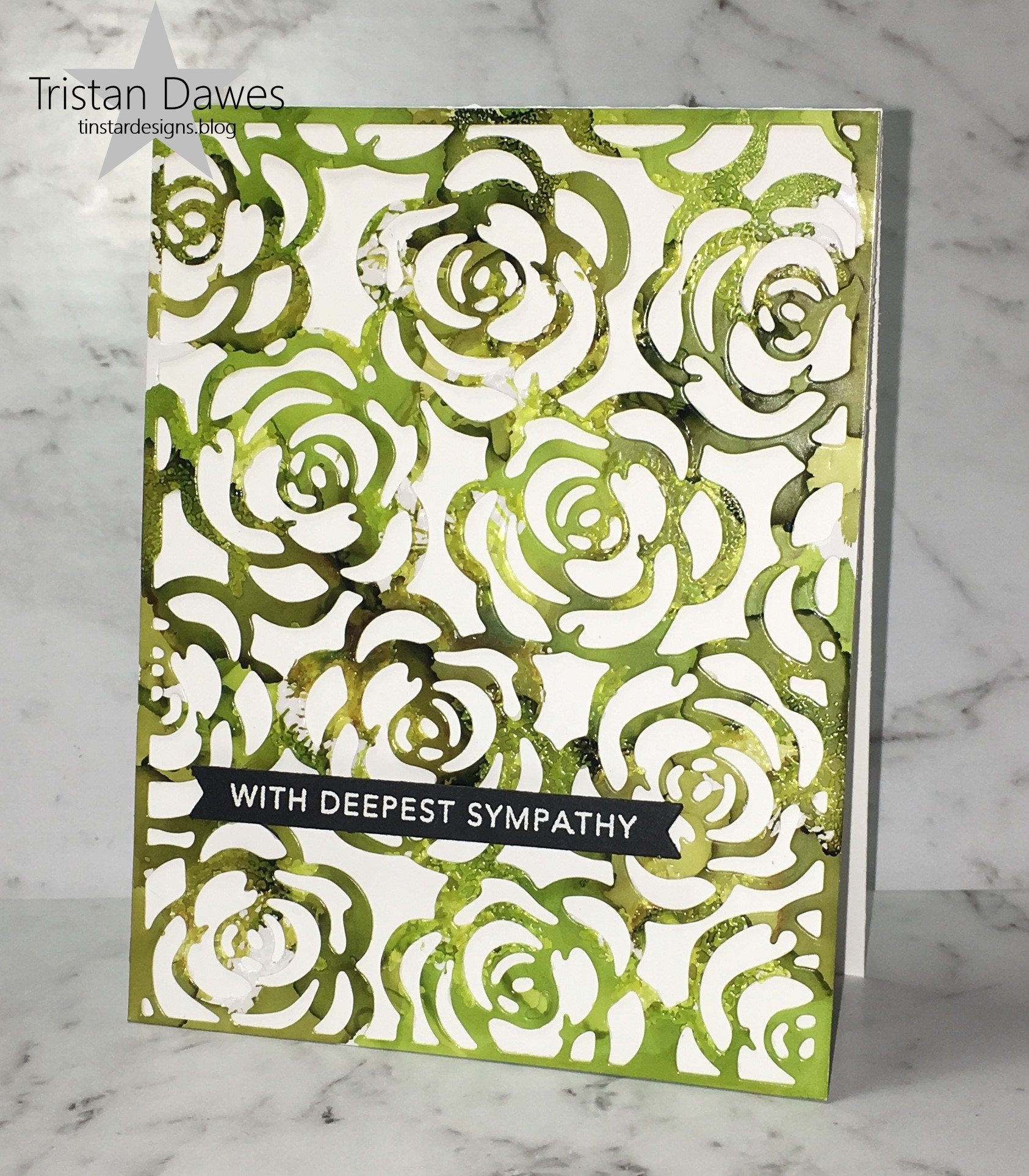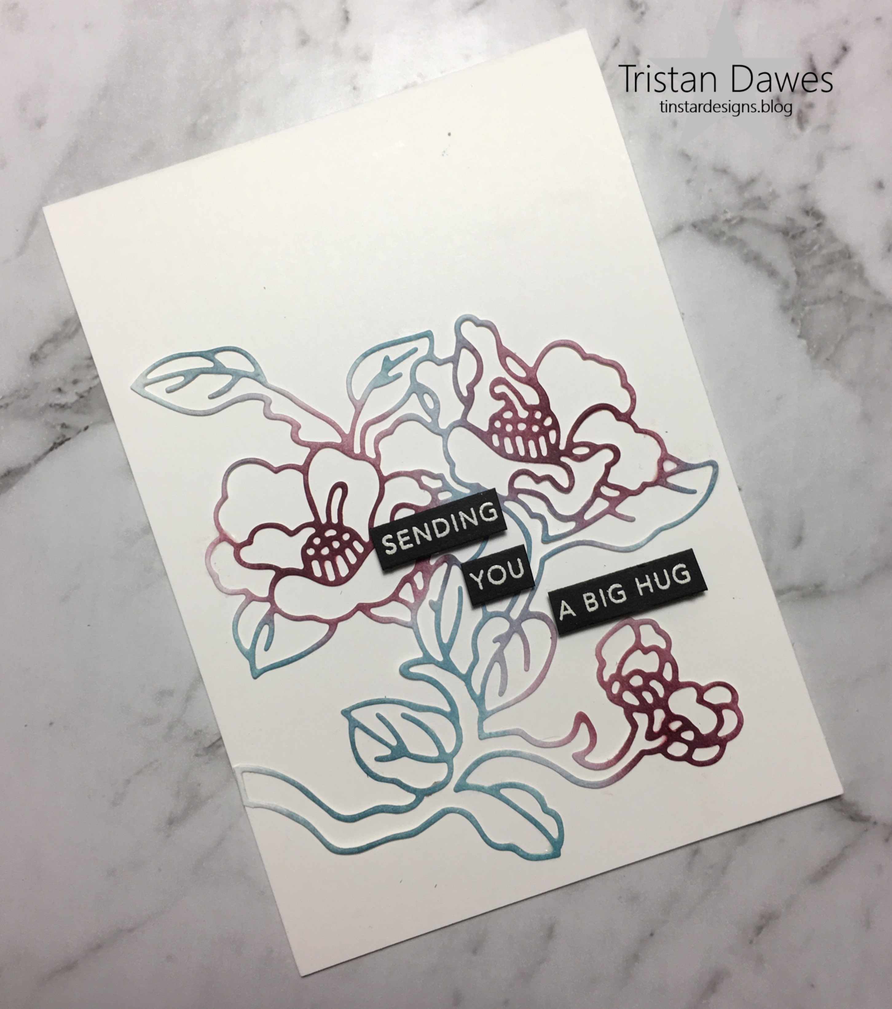 I had an alcohol ink background panel in my stash, so i decided to use it for this card with a floral die that covers the whole card. The sentiment is from Taylored Expressions ‘Simple Strips Background’.