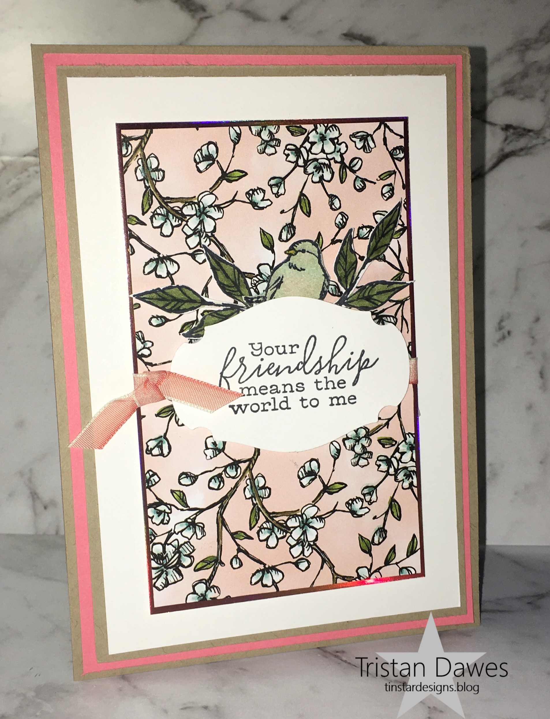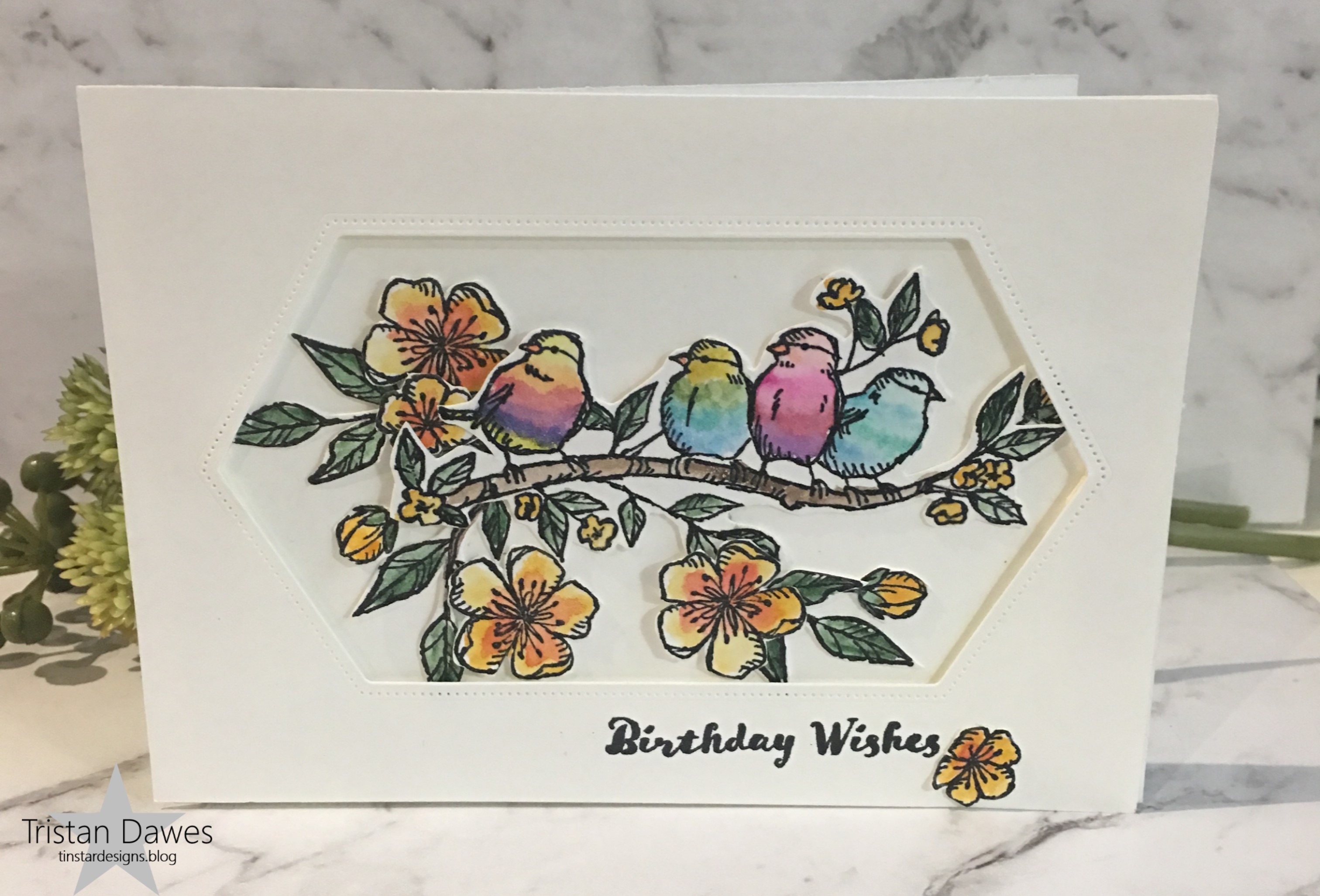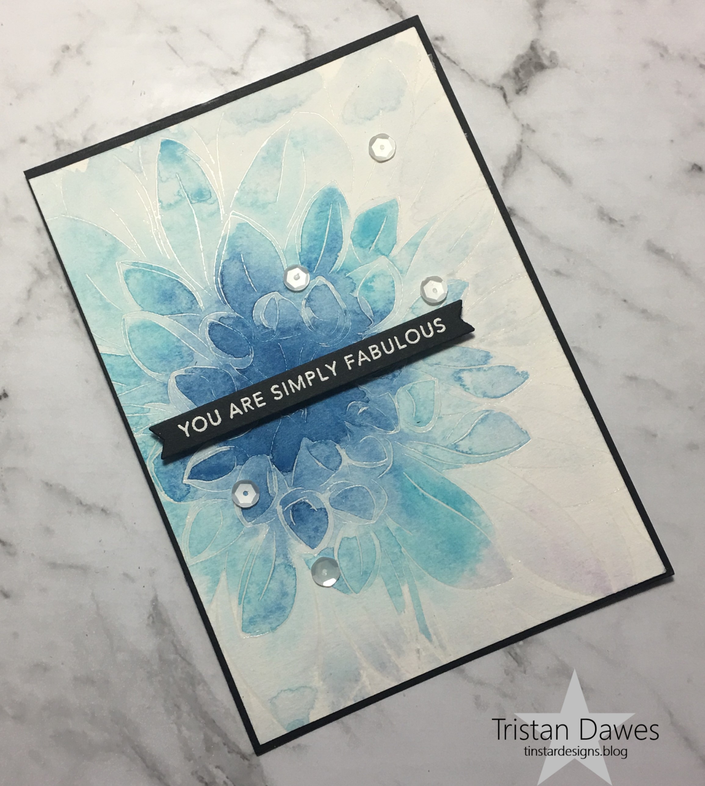 I had an alcohol ink background panel in my stash, so i decided to use it for this card with a floral die that covers the whole card. The sentiment is from Taylored Expressions ‘Simple Strips Background’.