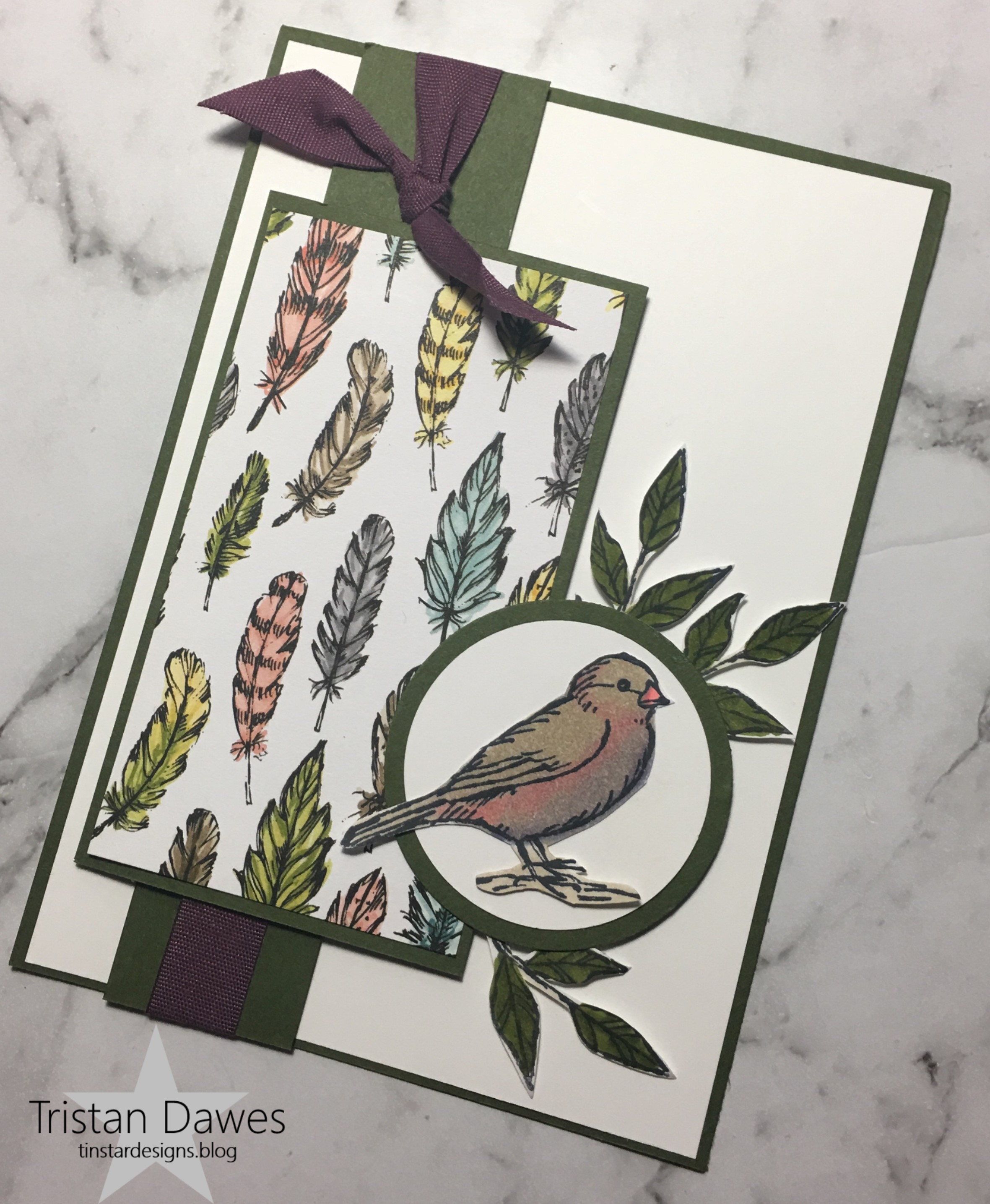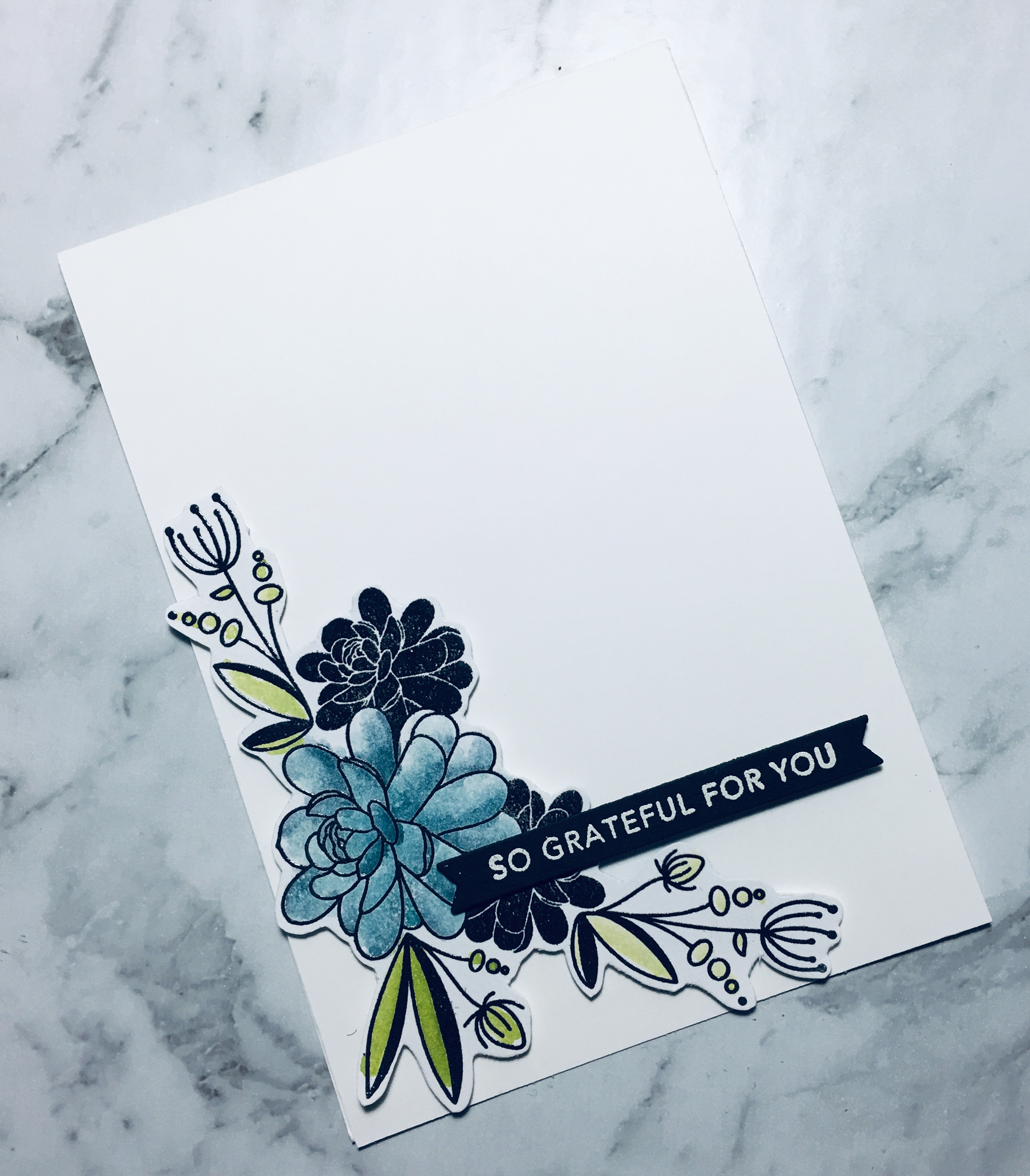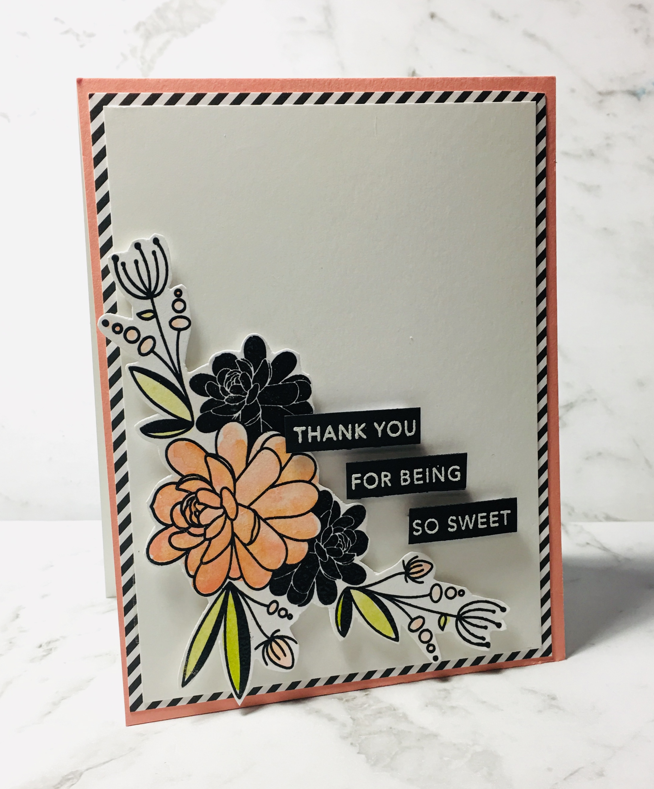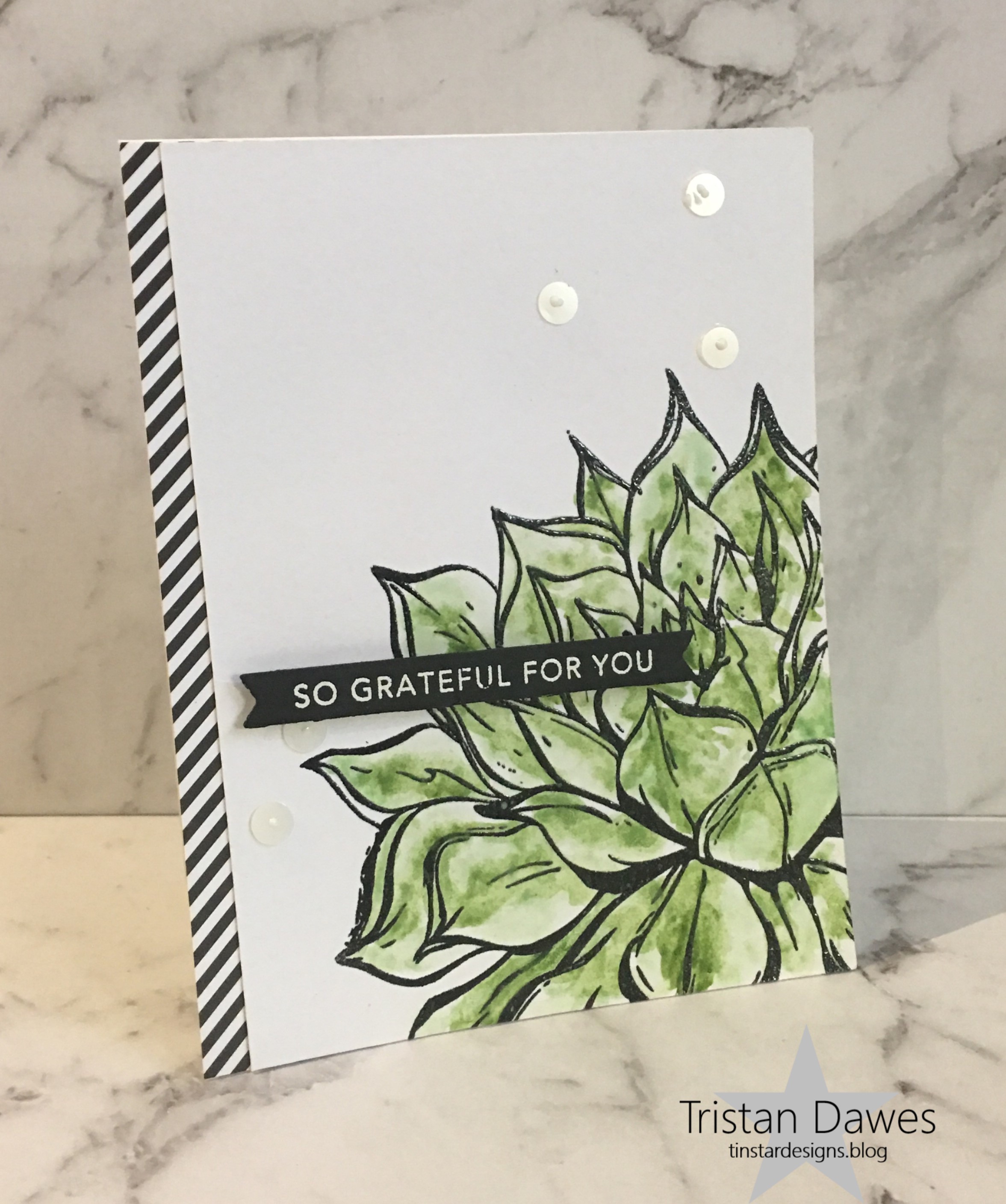 A used a stamp set from Uniko called ‘Happy Succulents’ which I water coloured and fussy cut out. I added another sentiment from Taylored Expressions ‘Simple Strips Background’ which I cut apart and added some diagonal stripe DSP onto a coral card base.