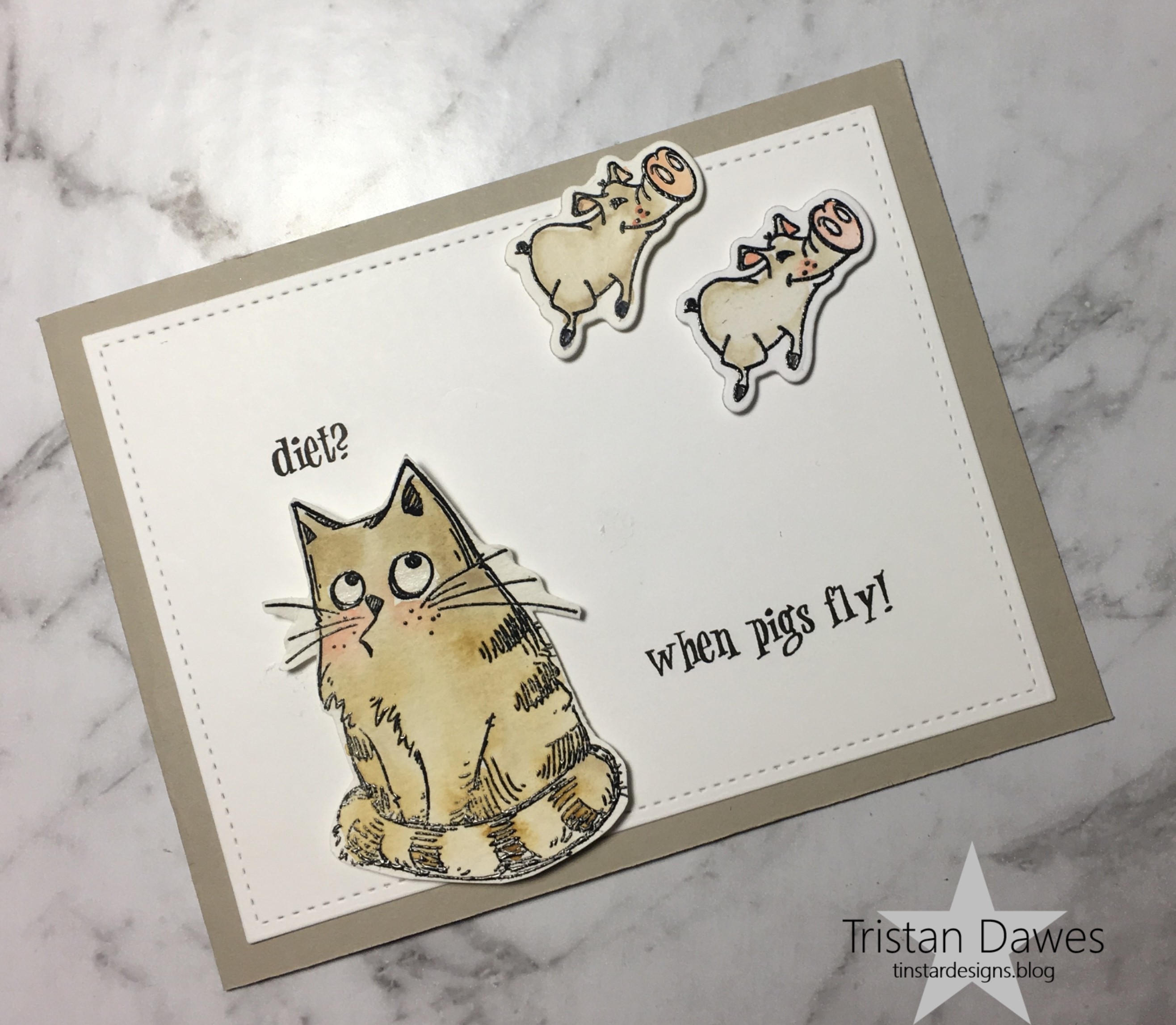 I love a funny card so quickly created a card with some images I had previously coloured and cut out and added a sentiment I created on my PC.
