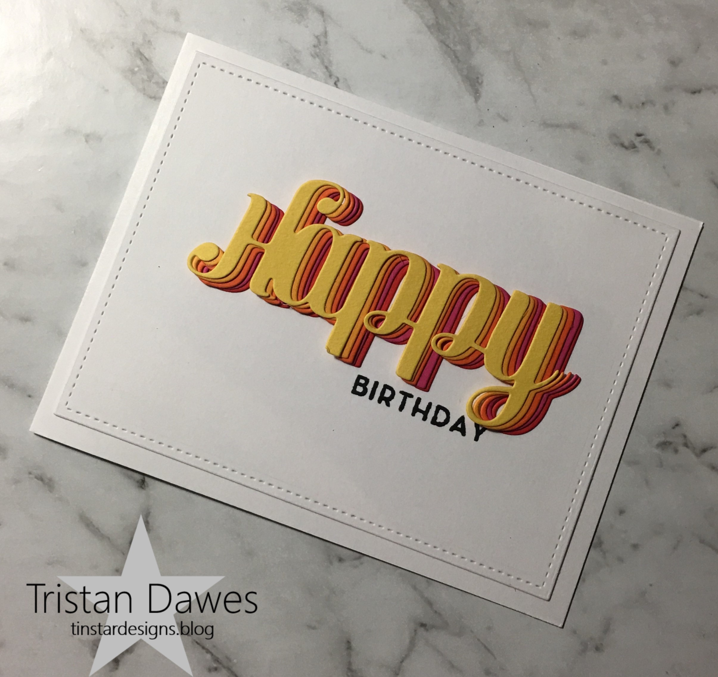 I was inspired to make a bit of a rainbow look on my card using the same Happy die cut out from 5 different colours (for the happy 5th birthday) and layered slightly off kilter. I added the word to a stitched card panel and then the base and I was done.