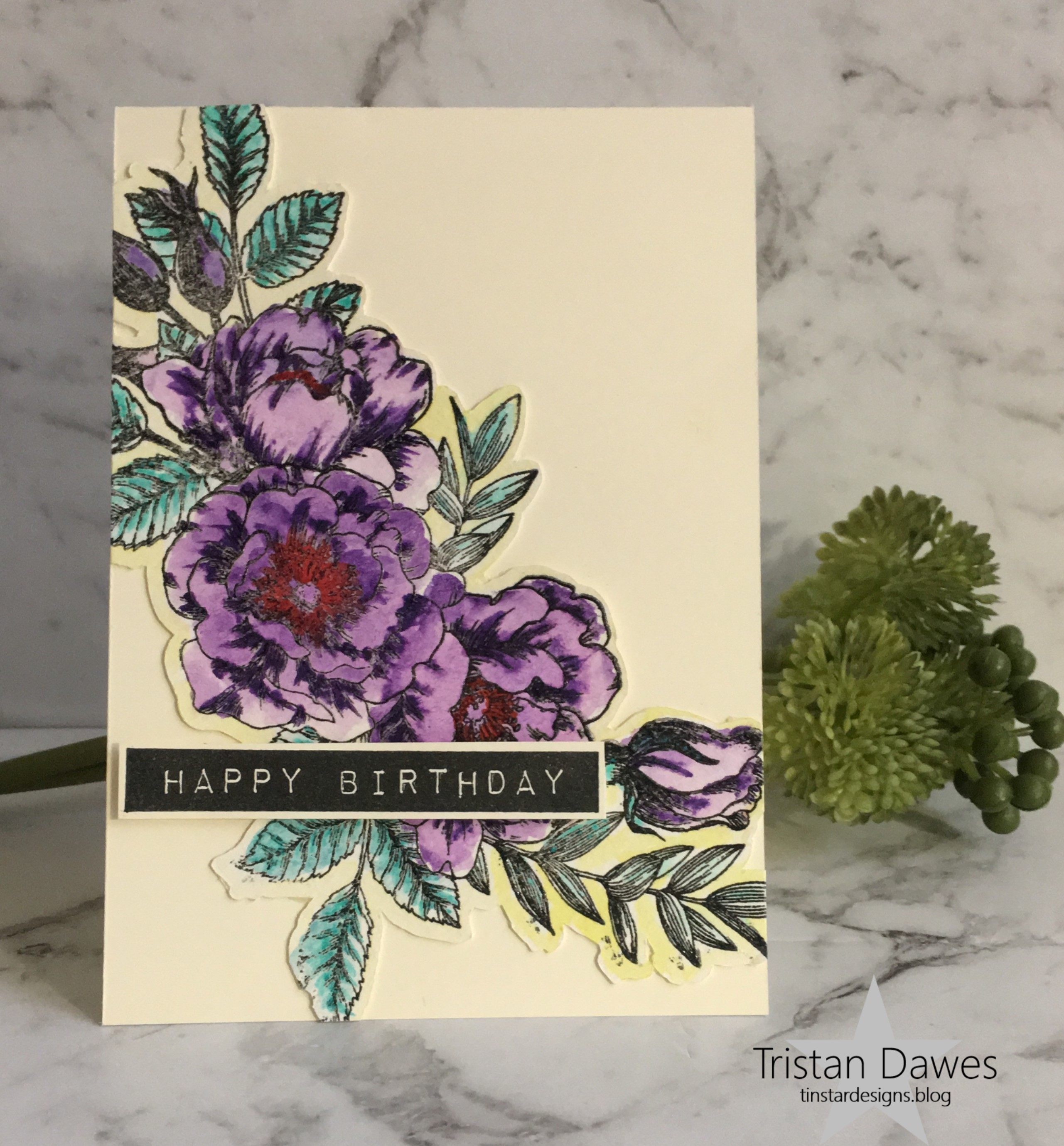 I love the colours in the dress, so used them to water colour my floral image from Simon Says Stamp ‘Beautiful flowers’ with my Altenew water colours. The sentiment is from Altenew ‘Label love’.