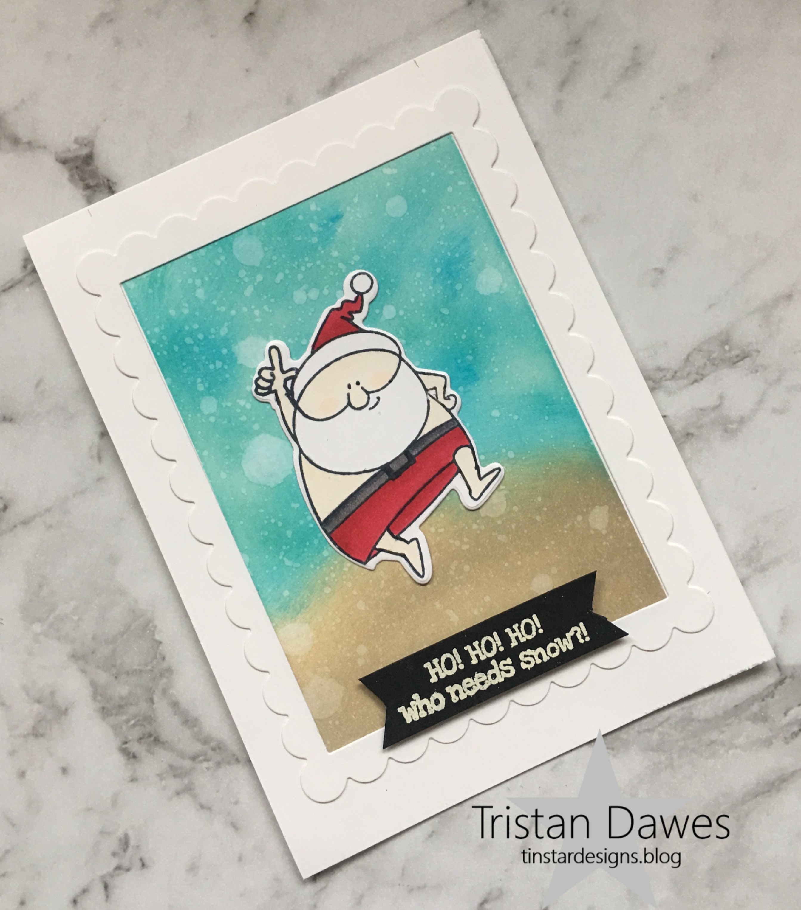 This is a usual type of Christmas here in Australia. I used and modified a set from MFT called ‘ Jingle all the way’ and coloured Santa in with my Stampin Blends; I used a sentiment from Stampin Up ‘So Santa’ and sponged the beach background with my Distress Oxide Inks and added a frame.