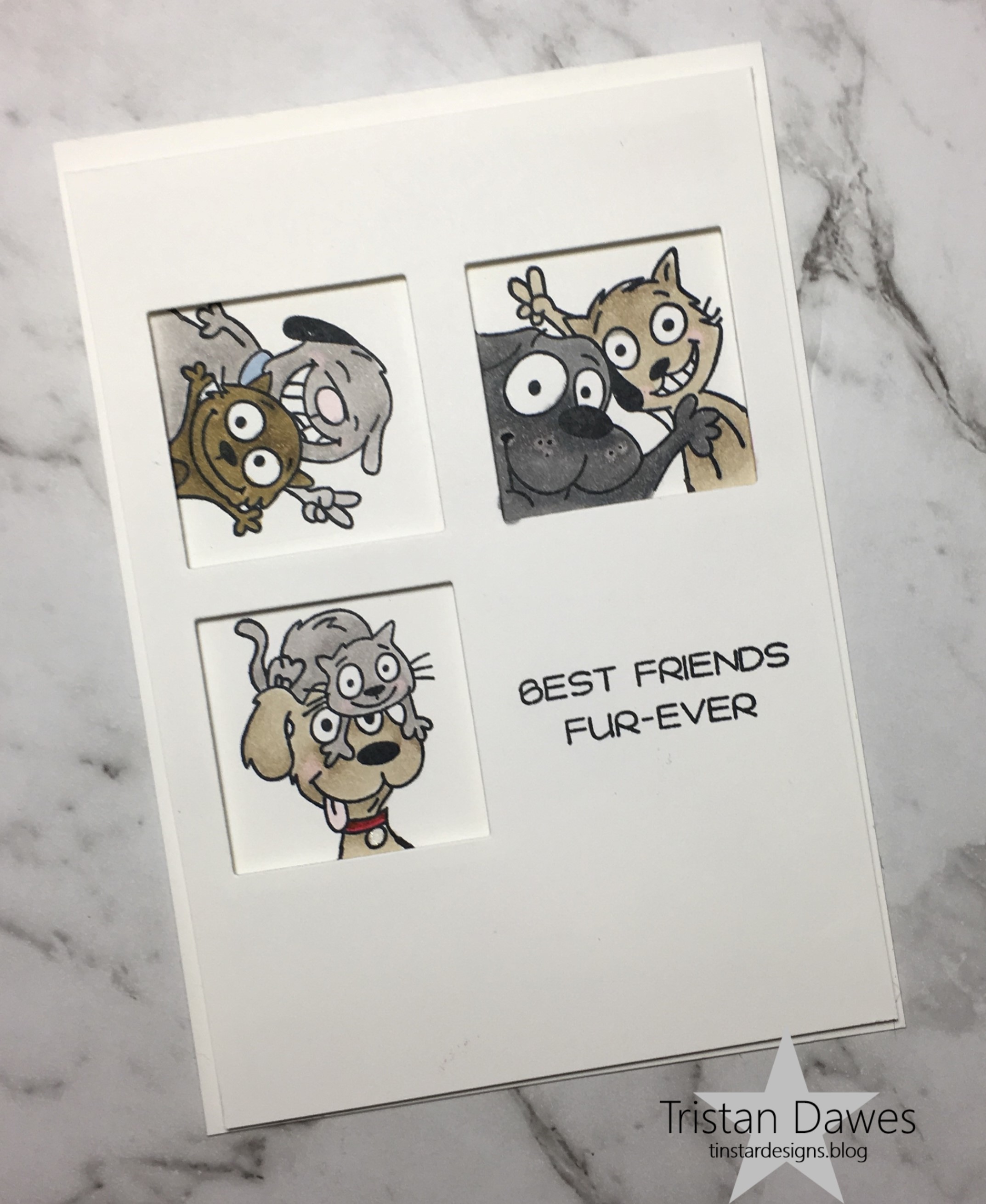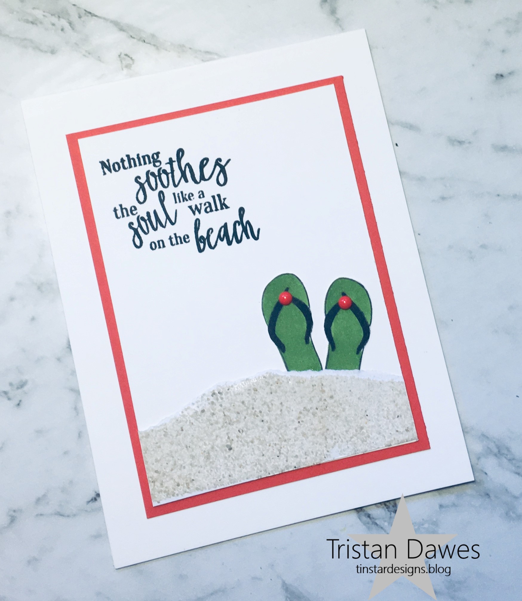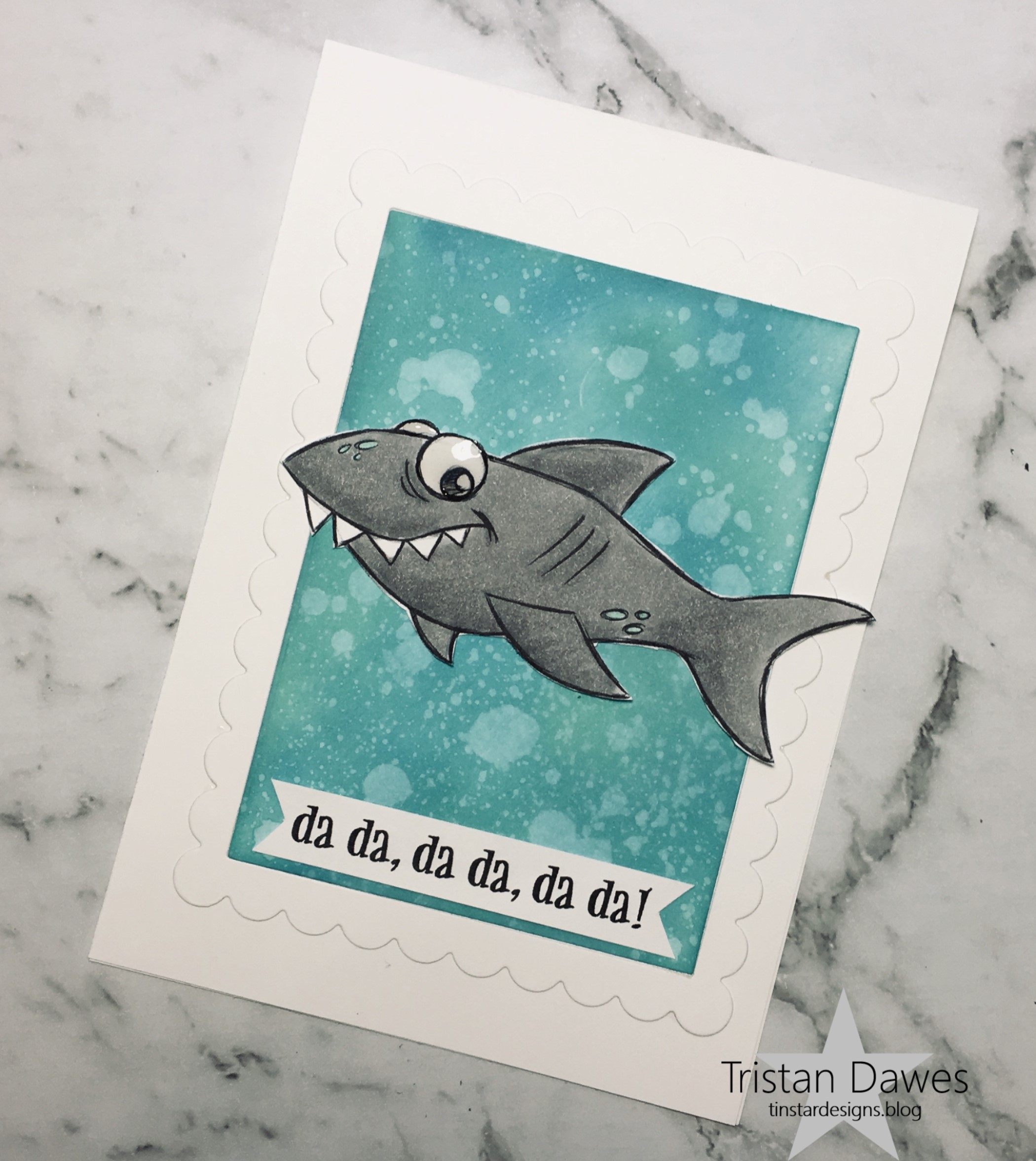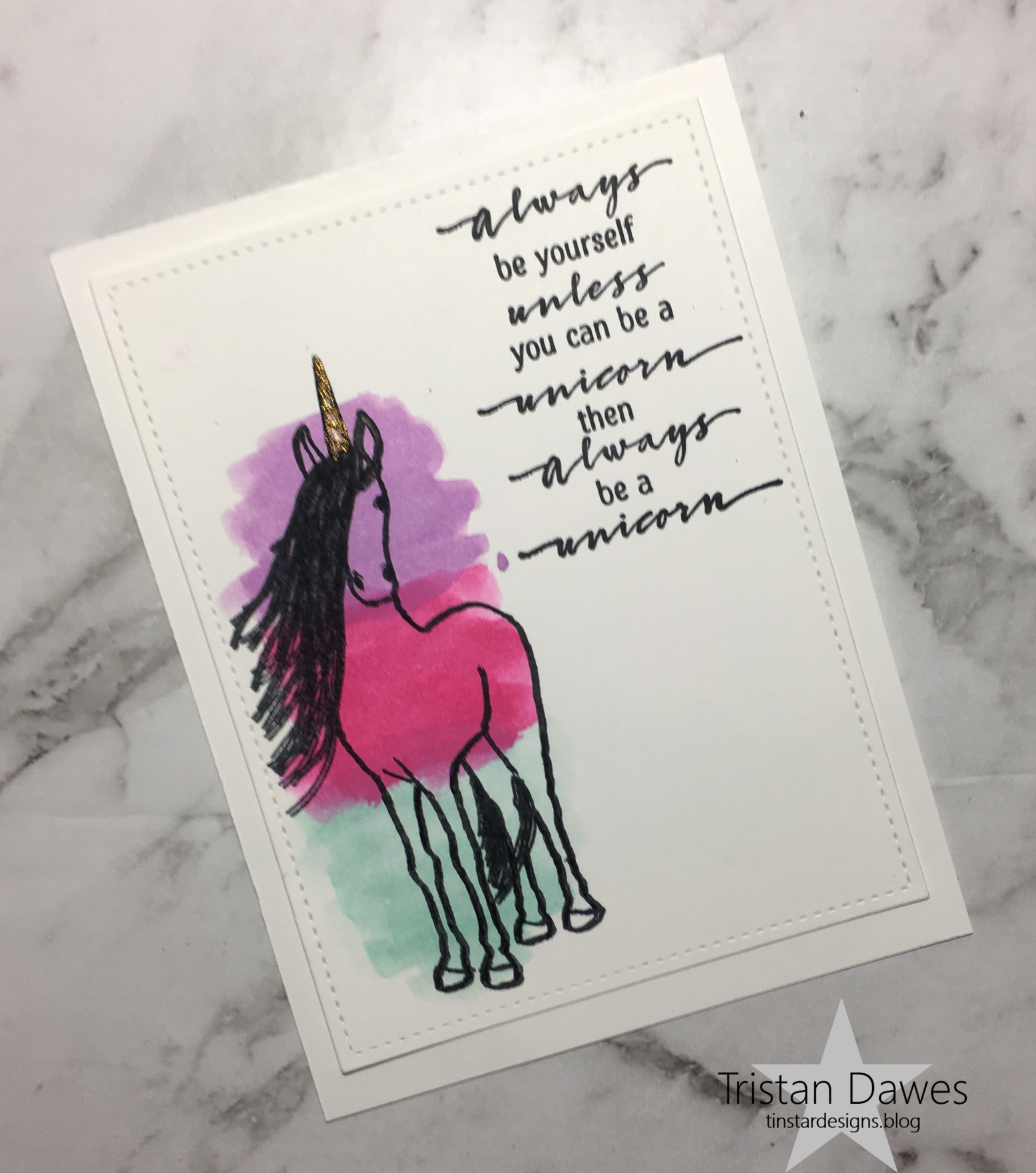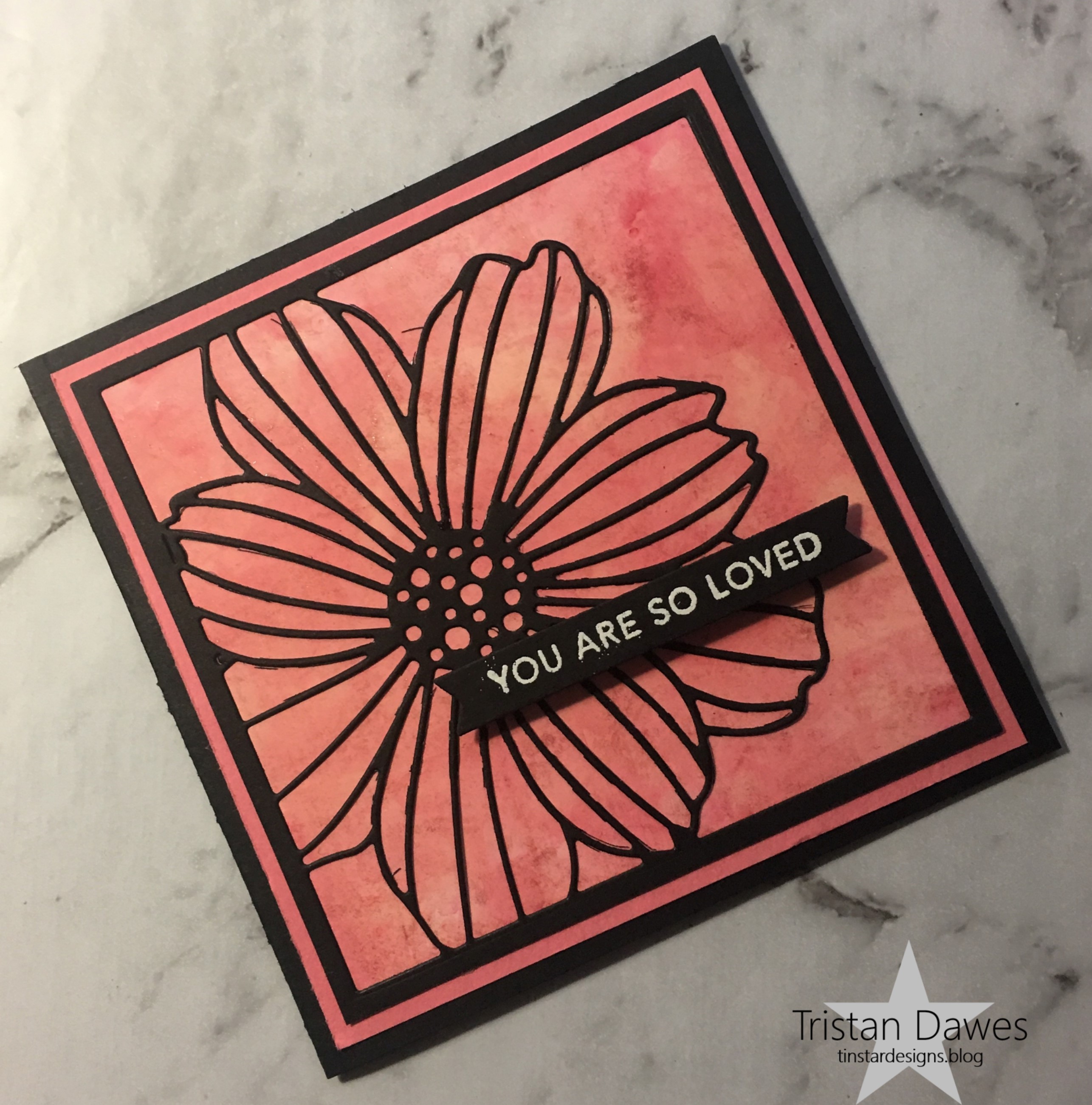 I created an alcohol ink background, which is sort of a shimmery coral colour. I then die cut a floral frame from back cardstock and layered them together onto a black card base. i added the sentiment from Taylored Expressions ‘Simple strip background’ and the card was done!