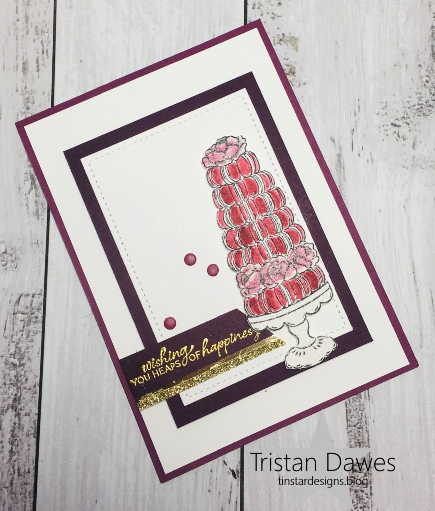 I was inspired by the layered cake in the photo along with the colour scheme. I used a Stampin Up set called ‘Birthday Goodness’ and inks in Merry Merlot and Berry Burst. I added a bit of Wink of Stella to the flowers and cake base for that extra bit of sparkle.