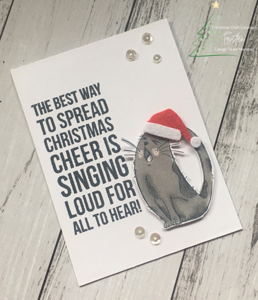 I used the singing cat from Katzelkraft #ktz152 coloured with my Stamin Blends and the sentiment is form Kaisercraft ‘Fa La La’.