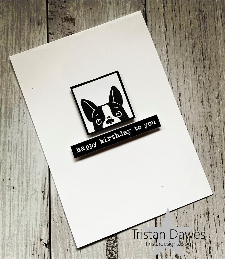 I used a cute little doggie from a Catherine Pooler Designs stamp set called ‘Peeking Pets’ popped on a one inch black matt.