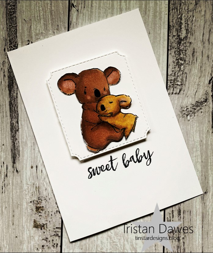I coloured an adorable stamp from Unity Stamp Co called ‘Koala-ty Friend’ with my Stampin Blends and die cut the pair out and popped them up on a white card base.