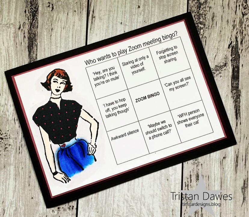 I’ve had plenty of experiece over the last 12 months with zoom meetings for work and have had a running joke with the team playing ‘zoom bingo’ so that inspired by card. I created the bingo cubes on my PC and the stamp is from Unity Stamp Co ‘PMS Peggy’.