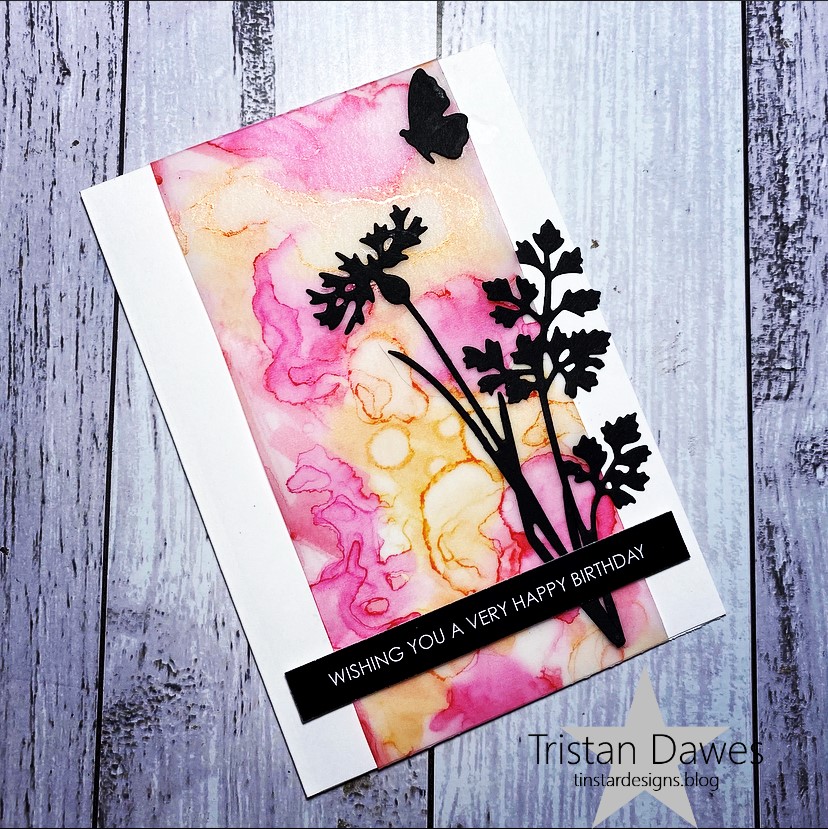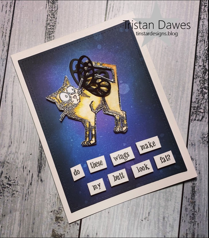 I was inspired by the blurry background in the photo and the idea of a hybrid kitty/butterfly. I used one of the Tim Holtz cats from the CMS251 set, heat embossed, watercoloured and fussy cut him out. I then gave him some die cut wings and a sentiment made on my PC. I popped him up on an ink sponged night sky background I had in my stash.