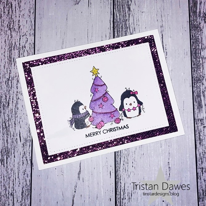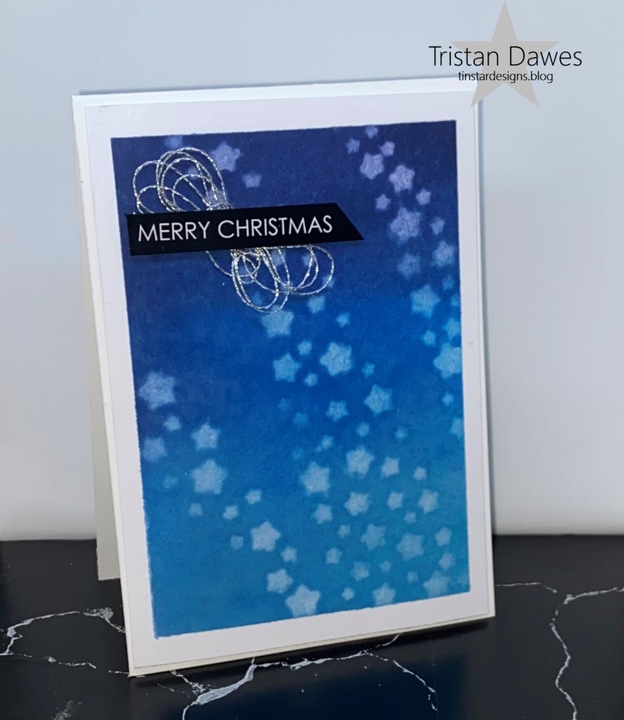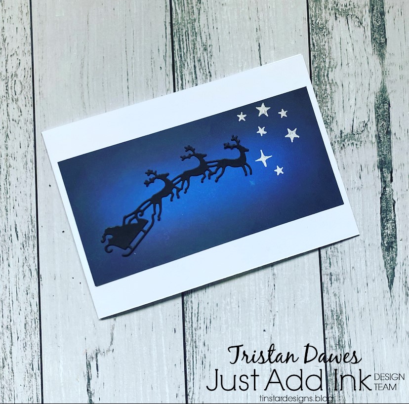 For my card I chose silhouette and stars. I decided to make a Christmas card and sponged a night sky with Distress Oxide inks in Prize Ribbon, Seedless Preservces and Black Soot. I added a die cut Santa sleigh silhouette and coloured a few stars. I left off the sentiment as I wanted the scene to be the hero.