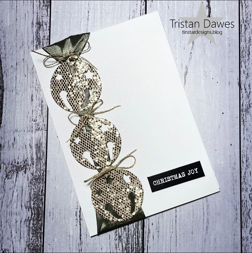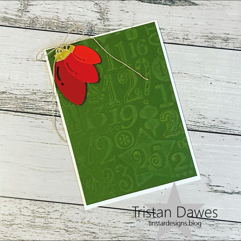 I was inspired by the sketch and followed the theme of Christmas for my card. I used a Cuttlebug embossing folder called ‘Numbers’ for my Stampin Up old olive background. I then die cut a series of Christmas lights from Stampin Up Cherry Cobler, Real Red and Poppy Parade cardstock and popped them up in the corner in place of the sketch circles. I opted for no sentiment as I wanted the embossed numbers to indicate the sentiment.