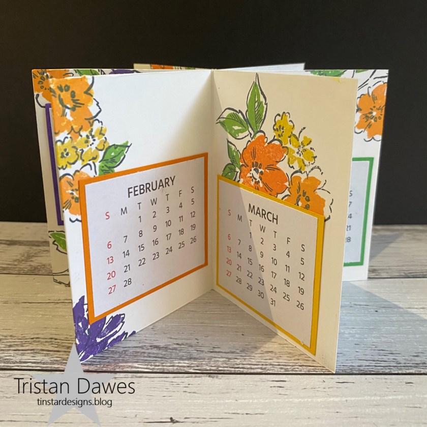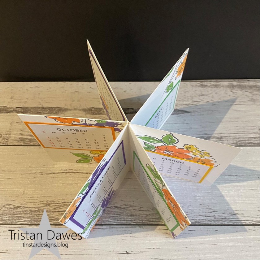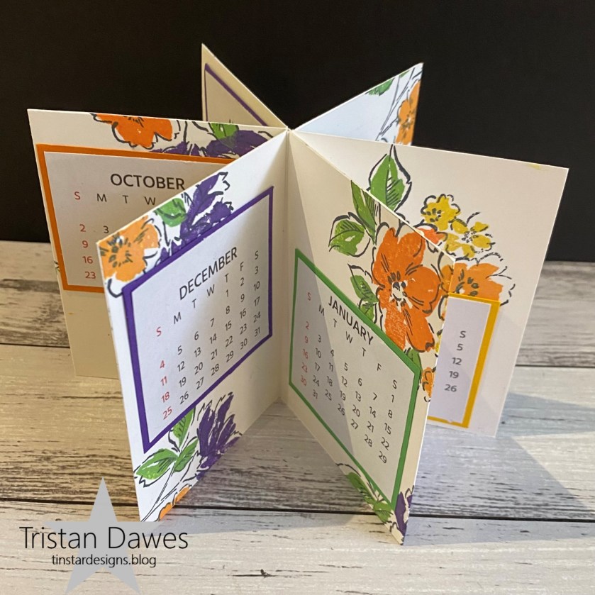 I decided to make a 3D project – a 2022 calendar that can sit nicely on a desk. I stamped the panels using the Stampin Up ‘Hand-Penned Petals’ stamp set.