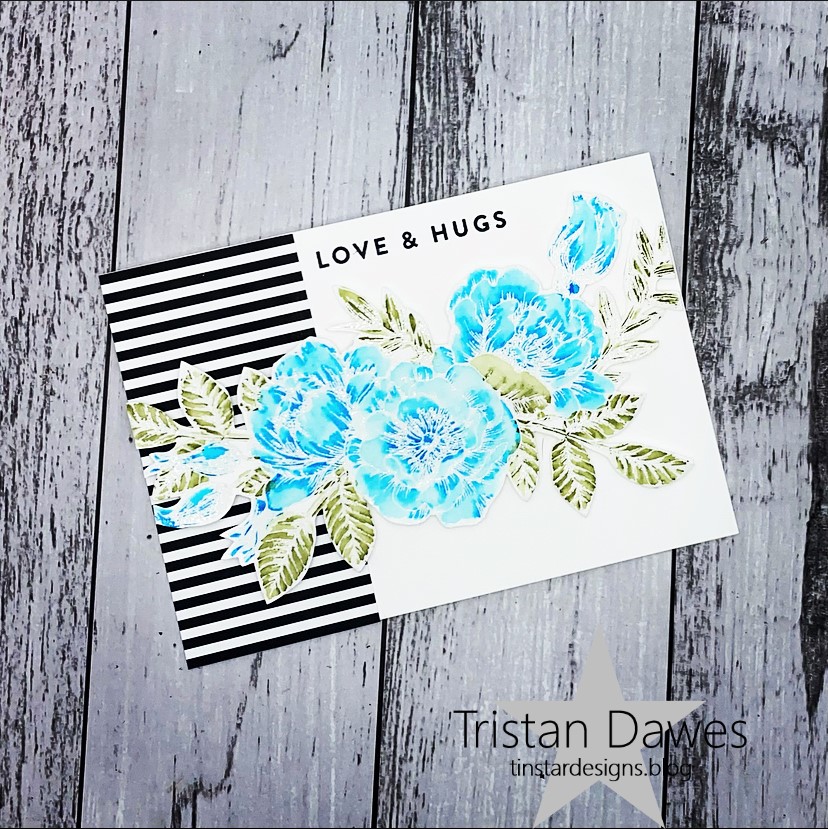 I love the look of those roses in the inspiration photo and knew I had to replicate them. I used the main flower from the Simon Says Stamp ‘Beautiful Flowers’ stamp set, clear embossed and coloured with my Zigs. I added a bit of black and white striped DSP behind the fussy cut and popped up flower to mimic the sketch.