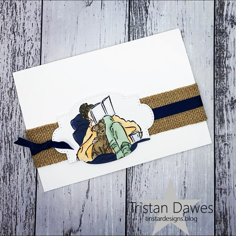 I was inspired by the sketch (which I flipped horizontally) and the books in the photo and new the Stampin Up ‘In the moment’ stamp set would be perfect for this challenge. I stamped the girl reading a book in bed and then coloured her with my Stampin Blends. Popped her up on some ribbon and hemp strapping. I opted for no sentiment so that I could pick and choose who and why I might send it in the future.