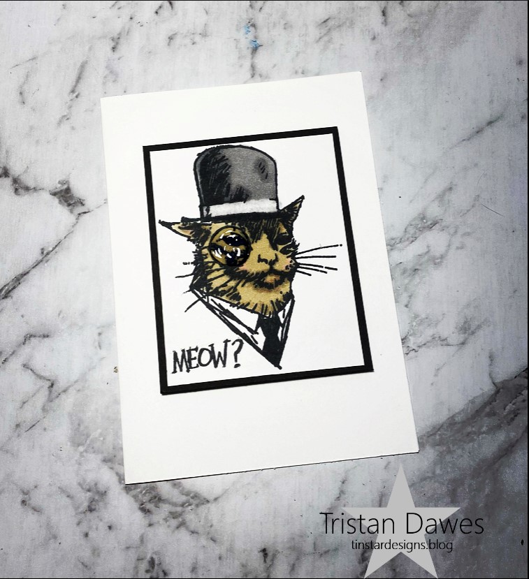 I have quite a lot of cat stamps, so had a bit of a hard time making up my mind as to which one to use for this challenge. I eventually went with Stampers Anonymous ‘Mister Meow Meow’. I coloured him with my Stampin Blends and added a bit of crystal lacquer to his monocle.