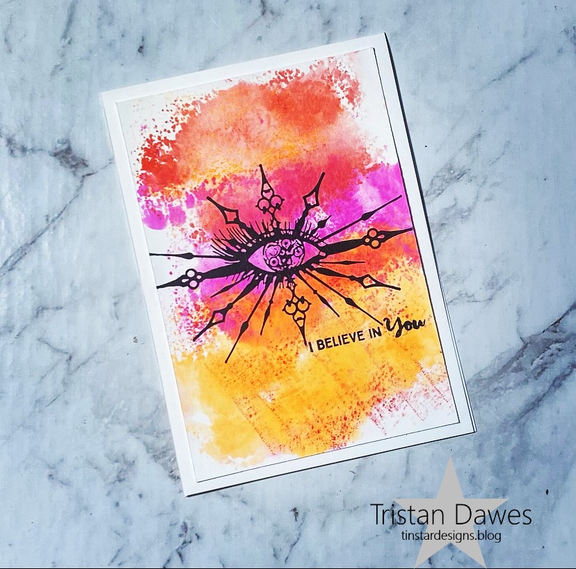 I created an ink smooshed background with 3 of my Hero Arts Neon ink pads (neon pink, neon red and neon organge). I then stamped an image from Bee Arty ‘Limited Edition’ and a sentiment from MFT ‘Anything but Basic Encouragement’.