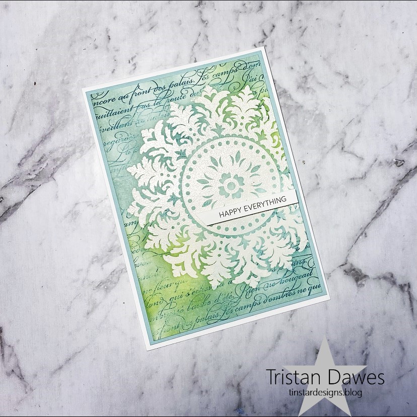 Again this was another hard choice as I have quite a few old stamps that I haven’t used for quite sometime but cannot bring myself to get rid of them. For this card I used two old Stampin Up stamps ‘Medallion’ and ‘en Francais’. I white heat embossed the medallion stamp and then sponged it with Pool Party and Lemon Lime Twist ink. Then I added some Island Indigo ink randomly on the text stamp and added it to the coloured panel.
