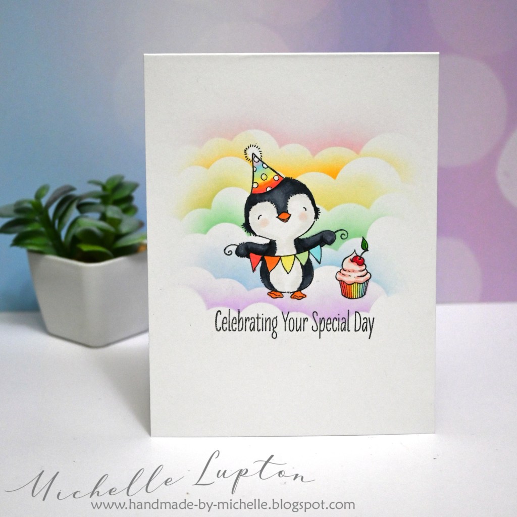 I was inspireed by the layout, the rainbow cloud sponging and the cute penguin above her sentiment.