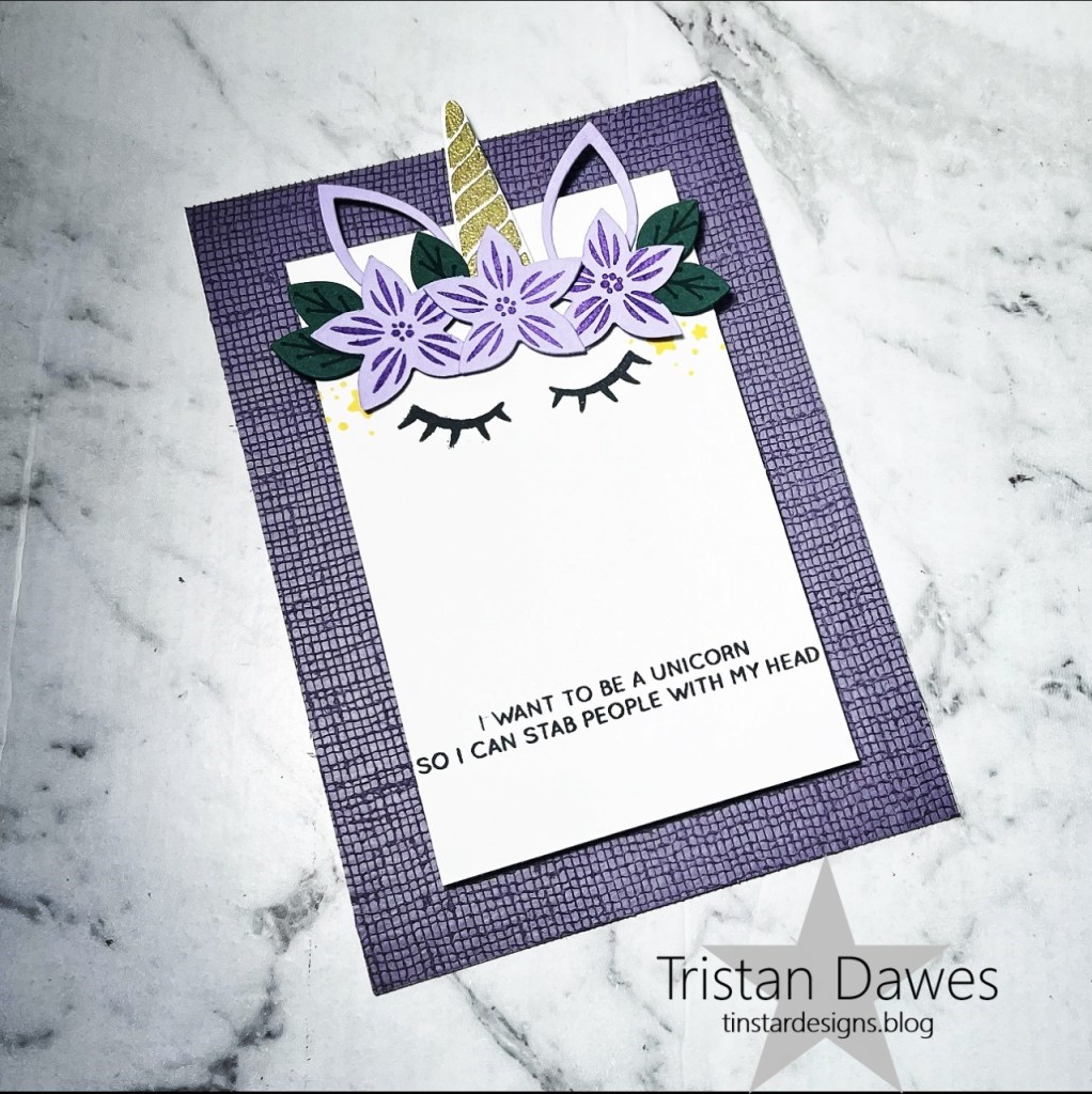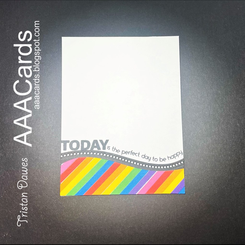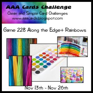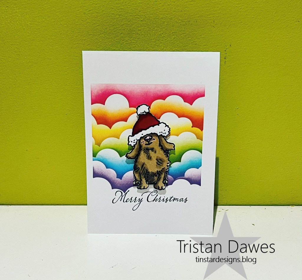 I sponged my rainbow clouds using Stampin Up inks in Highland Heather, Tahitian Tide, Granny Apple Green, Daffodil Delight, Pumpkin Pie and Polished Pink. I coloured and fussy cut the super cute Christmas dog from the Colorado Craft Company stamp set ‘Christmas Hats’ and added a Stampin Up sentiment from ‘Mistletoe Magic’.