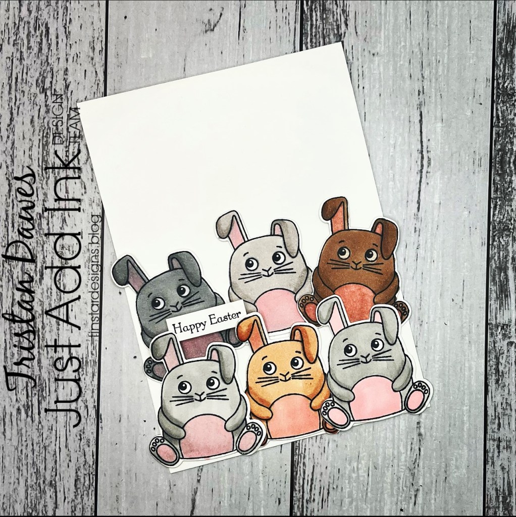 How cute are these cookies? I was inspired by the bunnies and decided to stamp, colour and cut out multiple bunnies from the SSS set ‘Cuddly Critters’. I didn’t want to overwhelm my card so kept the bunnies to the bottom of the card. The sentiment is from a retired Stampin Up set ‘Teeny Tiny Sentiments’.
