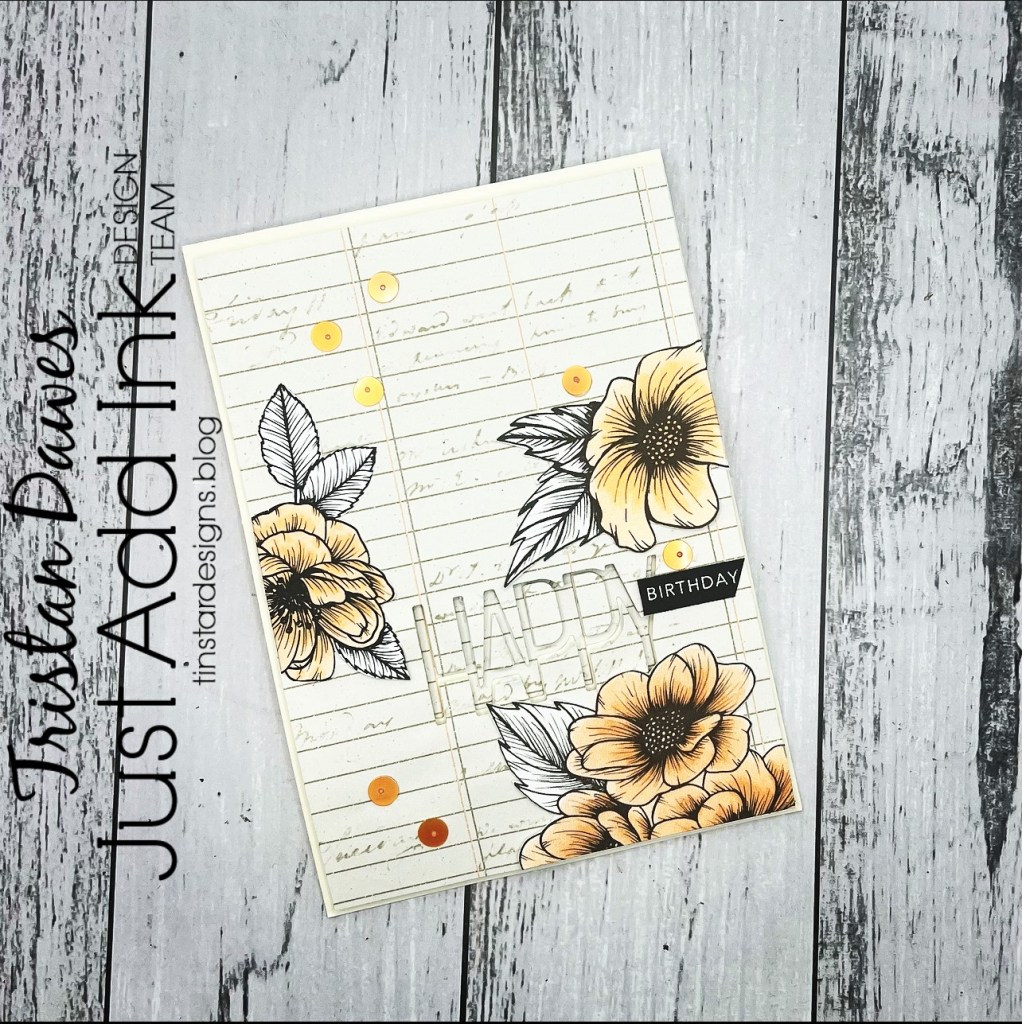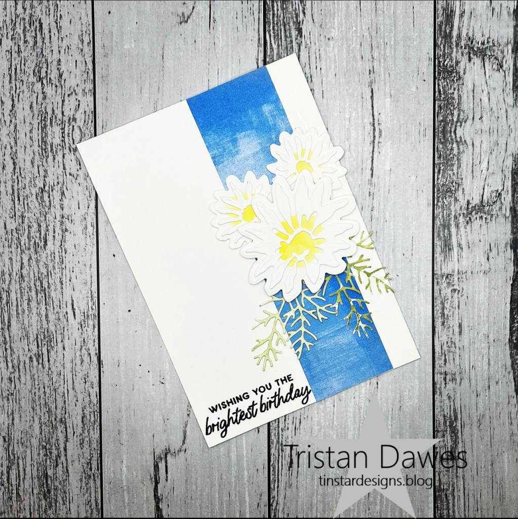 I used a new to me stamp set and matching dies from Stampin Up called ‘Cheerful Daisies’ that I inked up in Daffodil Delight ink. I applied a vellum petal overlay and then some pearls for the flower centres.