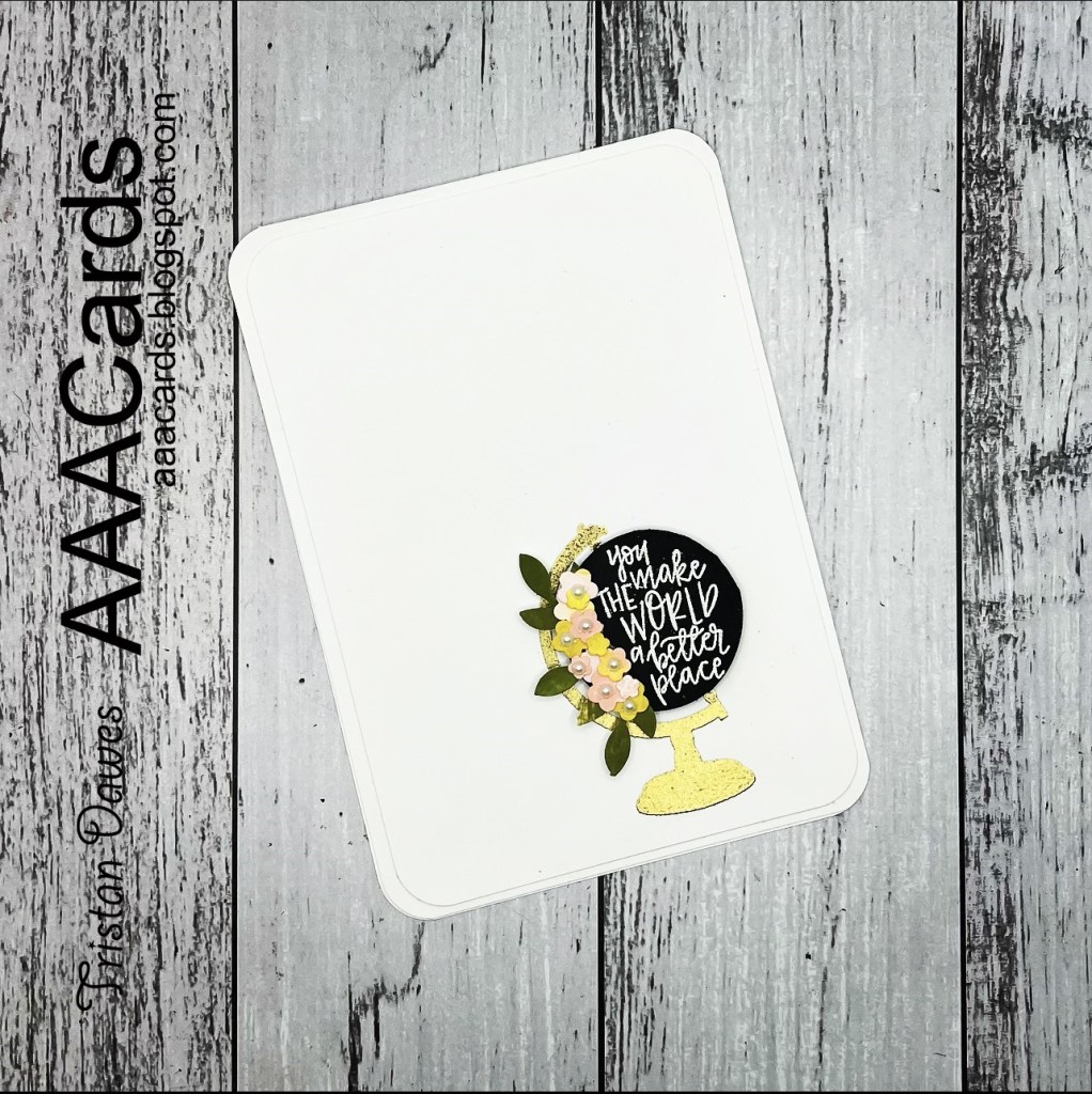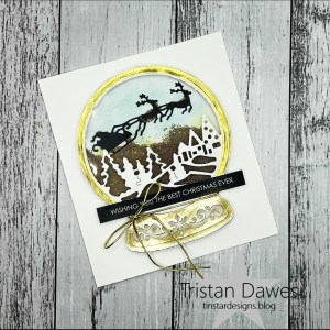 I had a snow globe die in my collection and I decided to make a shaker card. I die cut the globe from some white cardstock first and then added a gold layer on top, sponged some grass and sky on the background panel. I die cut Santa and his reindeer and put them inside the globe along with some gold seed beads, attached a sentiment to the front with some gold thread and my card was done.
