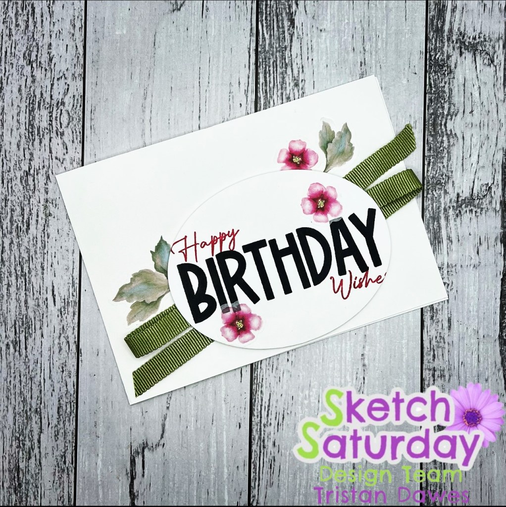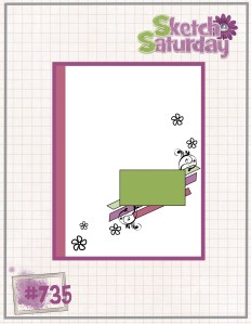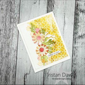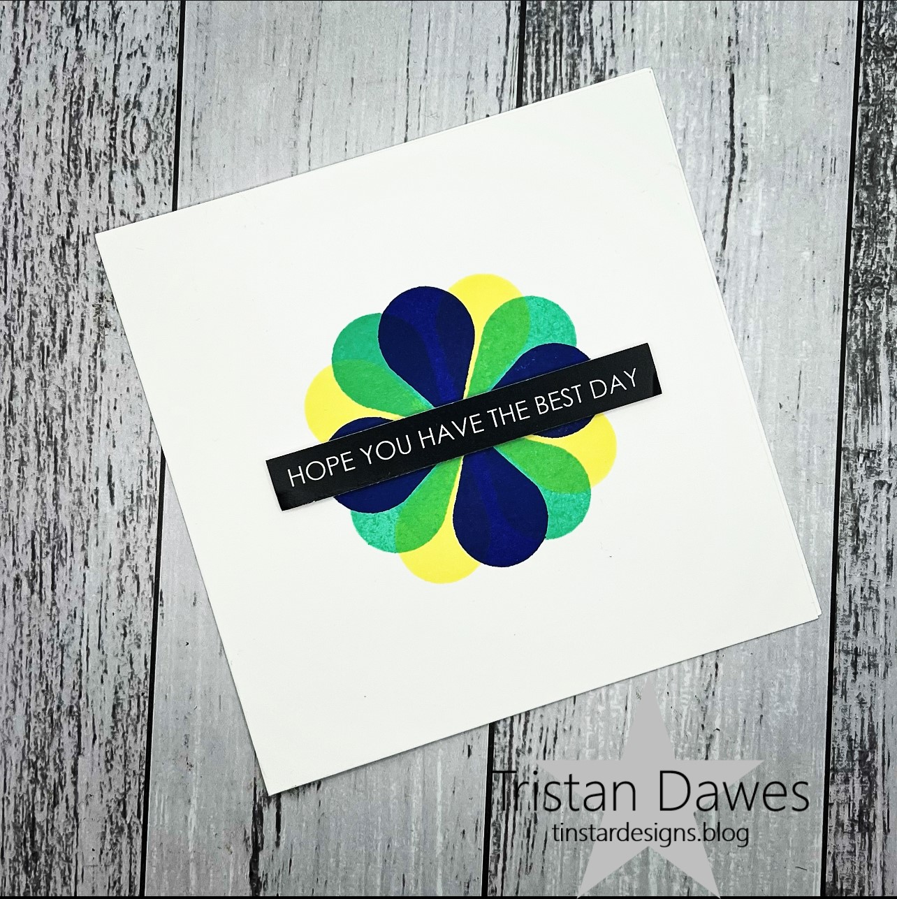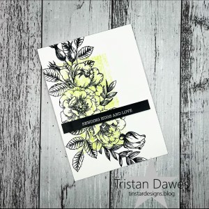 I chose the centre horizontal options of pens/pencils, your choice and leaves. I used a stamp set from Stampin Up circa 2008 called ‘Oh so Lovely’ and chose the graphic panel stamp which I coloured with my Stampin Markers (pens) in Certainly Celery and stamped the image 3 times across my base. I then stamped the SSS ‘Beautiful Flowers’ across that green area (leaves on the flowers) and kept my card otherwise monochromatic (my choice).