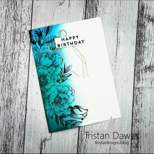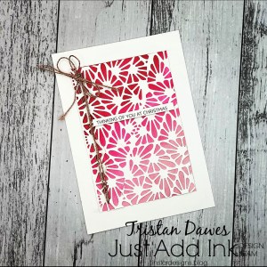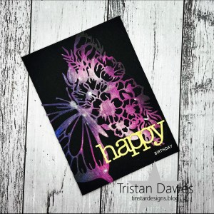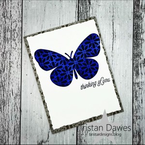 Some months ago I bought some masks from Stampin Up but hadn’t played with them till now. First I sponged the butterfly base in Starry Sky, then I sponged Night of Navy ontop with the floral mask. I sponged another floral mask on the card base in Gray Granite. The sentiment is from SU Special Moments’.