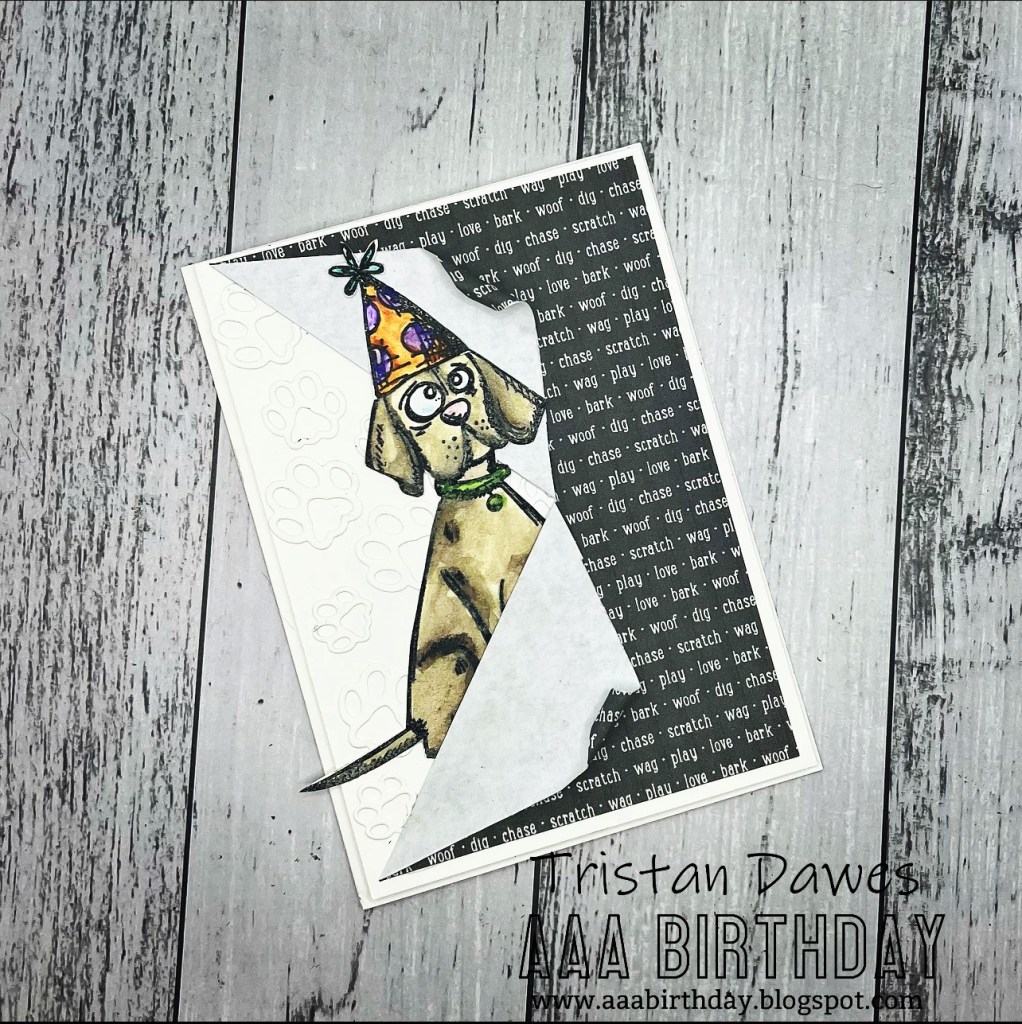 Anyone who knows me knows that I love adding animals to my cards, so this is a perfect theme for me. I used one of the Tim Holtz dogs from the ‘Crazy Dogs’ stamp set along with a party hat from ‘Crazy Things’. I loosely water coloured them, then fussy cut them out. I took some Stampin Up DSP from ‘Playful Pets’ that I folded back so I could pop my pup peeking from behind. The background is created with a series of die cut paw prints. I love how this card came out.