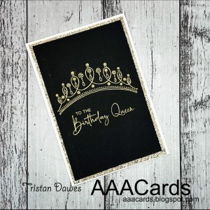 For my card I used a new stamp set from Stampin Up called ‘Friendship Royalty’ that I heat embossed with gold embossing powder, popped the black panel up on some glittery gold card stock and then onto a white card base.