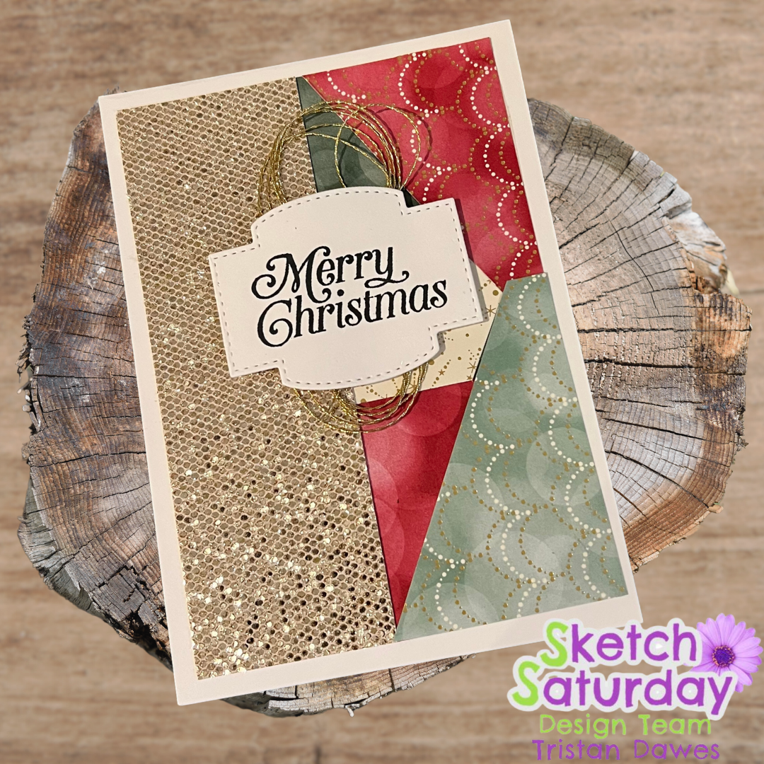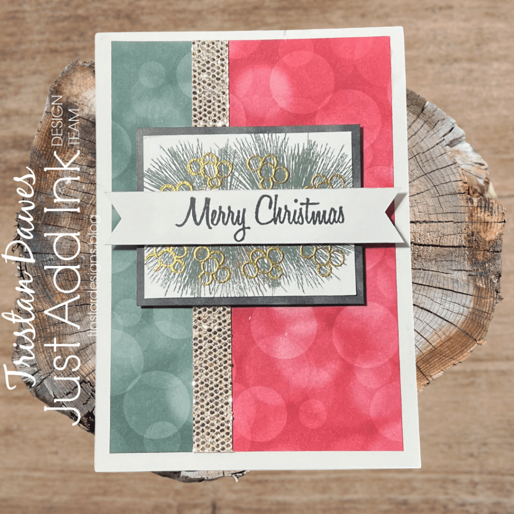 For my card I used some Stampin Up Lights a glow DSP (retired). I love the bokeh red and green panels. I added some gold glittery cardstock separating the 2 panels and the stamped some pine needles and berries from the Ton ‘Outline Holiday Cones’ under my sentiment which is from the Stampin Up ‘Perfectly Plaid’ stamp set (retired).