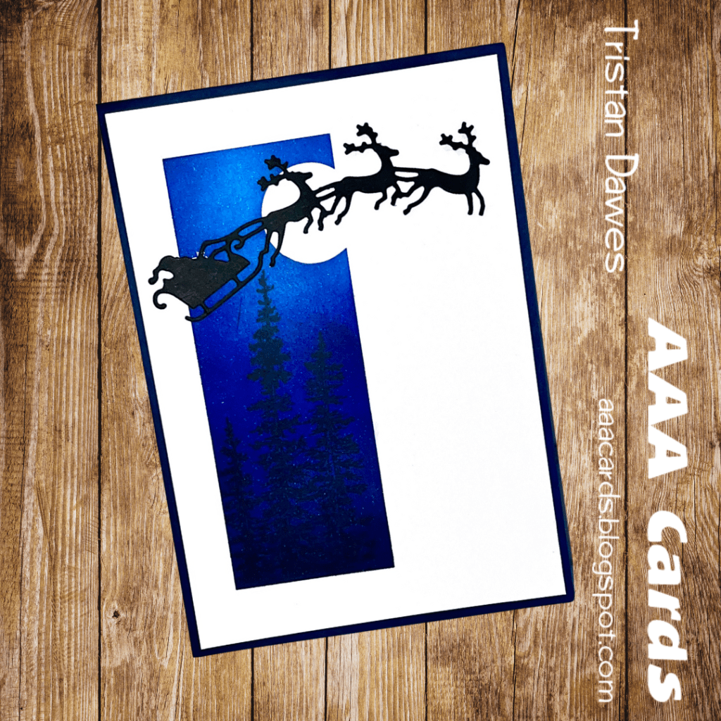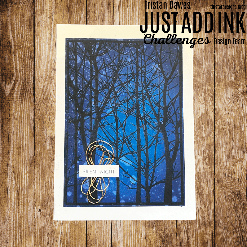 I was inspired by the night sky images in the board so did some sponging with Stampin Up inks in Pacific Point, Starry Sky and Night of Navy. I sprinkled a bit of water and patted it dry to make them look a bit like stars and then stamped the Bare Forest stamp from Indigo Blu on top and added a sentiment from Uniquely Creative and some gold thread to soften the darkness of the card.