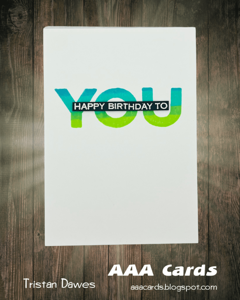 I went with the twist to make my sentiment the focus on my card. I stamp the large YOU from the MFT ‘All About You’ stamp set. I used my Kaleidacolor stamp pad in ‘Carabbean Sea’ to get that graded colour. I then white heat embossed the rest of the sentment on some black cardstock.