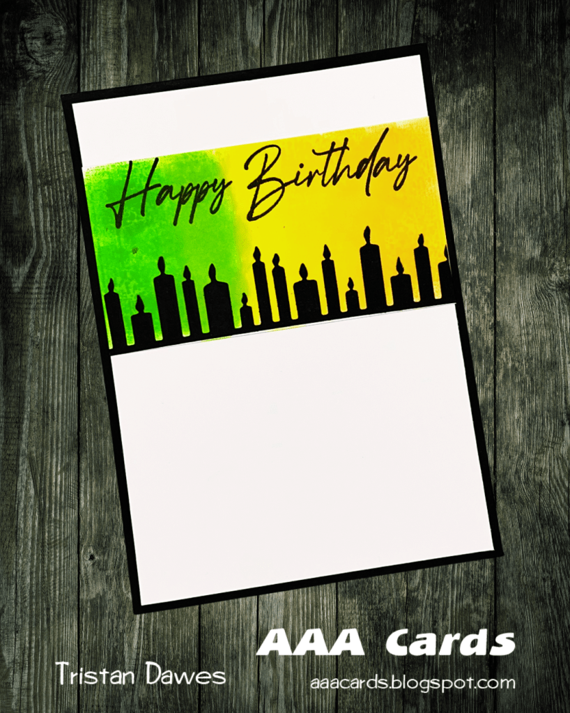 I used one of my Kaleidacolor tamp sets in ‘Melon Melody’ which I blended on the top portion of my card. I then added a candle die along the base of the ink panel and then stamped the sentiment from Edgy’s ‘Basic Bitch’.