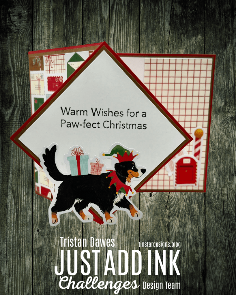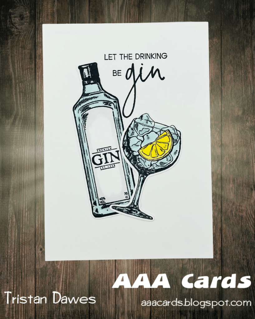 I was inspired by how Karen centered her coloured focal image and had her sentiment underneath. I changed it up slightly by putting my sentiment at the top of my image and opted not to have a sponged background. I used a new stamp set from Visibly Images called ‘Keep your gin up’ which I coloured wth a variety of Stampin Blends.