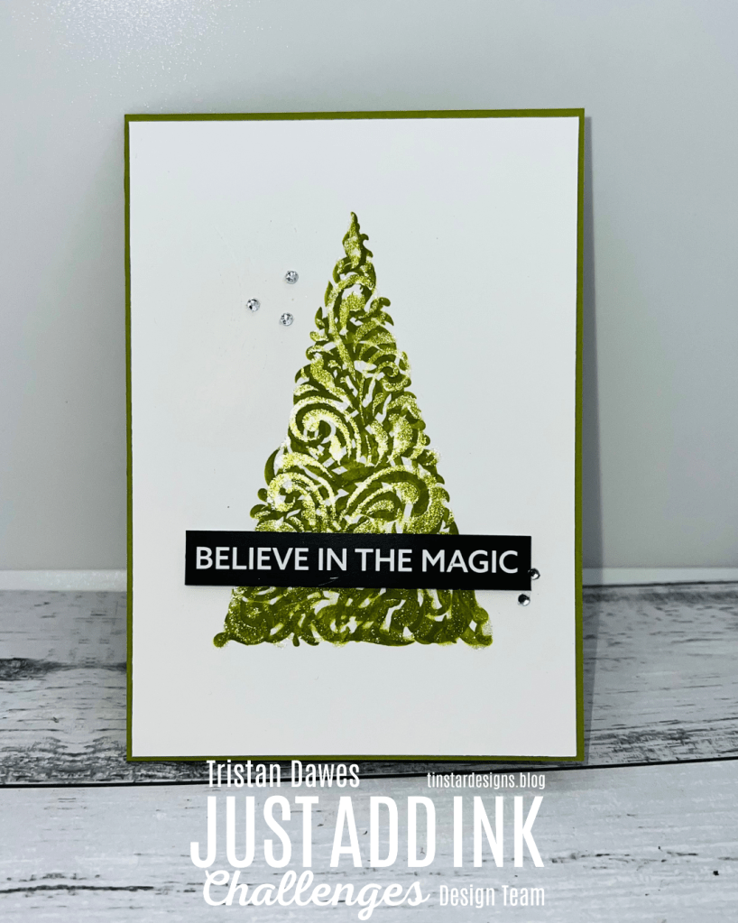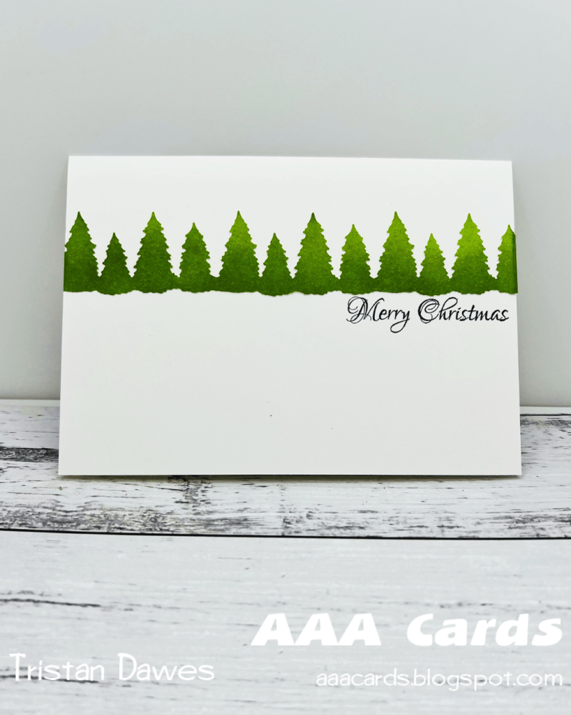 I sponged a scrap bit of white cardstock with Stampin Up Old Olive and pear Pizzaz inks to blend the colours for my trees. I then used a tree banner punch to cut the strip of trees out and added a sentiment from Clearly Besotted ‘Modern Christmas’ and my card was done. Love it when card making is this simple!