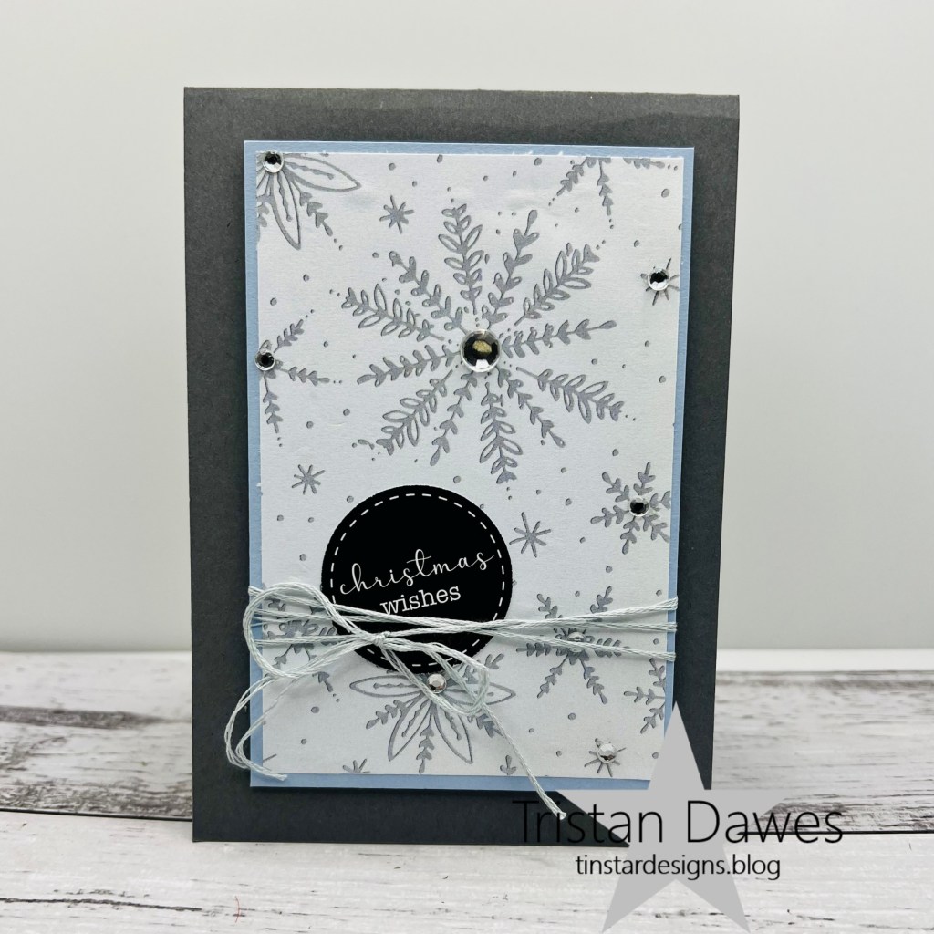 I was inspired by the falling snowflakes in the photo and knew I had the perfect DSP scrap in my stash that was covered in different sized snowflakes. I mounted the DSP on some light blue cardstock and then onto a dark grey cardbase. I had some grey thread which I wrapped it around for a bow, added a sentiment from Uniquely Creative and some gems to the centres of the snowflakes for that finishing touch.
