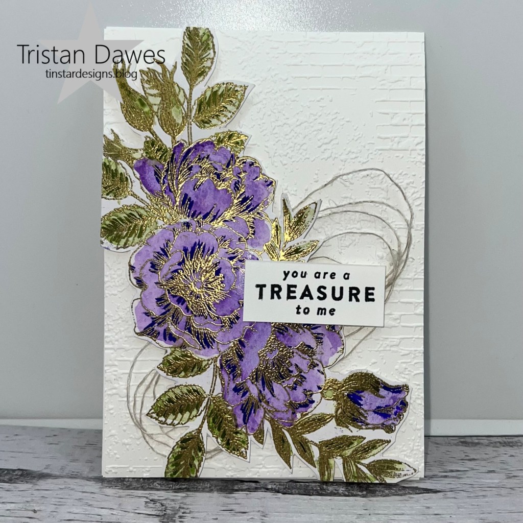 One of my favourite card marking techniques is heat embossing. So I heat embossed the flower from the SSS “Beautiful Flowers’ stamp set with some gold embossing powder. I then loosly coloured it with some purple and green water colour inks and then fussy cut it out. I used the Stamping Up ‘Exposed Brick’ embossing folder to add some texture to my background panel and some twine to ground the floral image and popped the sentiment on top.