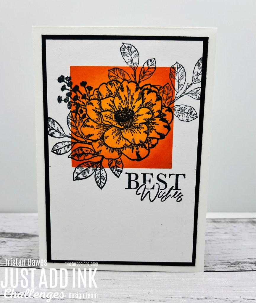 I masked off my square and then sponged Tim Holtz Distress inks in Dried Marigold, Carved Pumpkin, Spiced Marmalade and Ripe Persimmon. I then stamped the flower, leaves and sentiment from the Stampin Up ‘Cottage Rose’ stamp set.