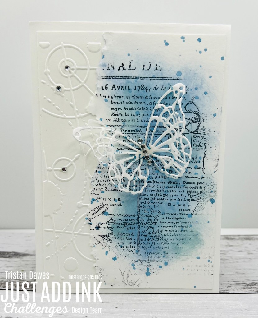 This theme allows for many interpretations from angel wings, buterfly wings, birds etc. I opted for a die cut butterfly on my card – I cut one in vellum and one in white card stock and layered them on top of each other. My background I embossed a panel using the Couture creations ‘Symbols’ folder and then on the other panel, I tore the long edge, sponged Tim Holtz Distress Oxide ink in Specked Egg and Unchartered Marina. I stampted an unknown text stamp oer the sponging, splattered some of the Unchartered Marina ink and added some diamentes for some bling bling.