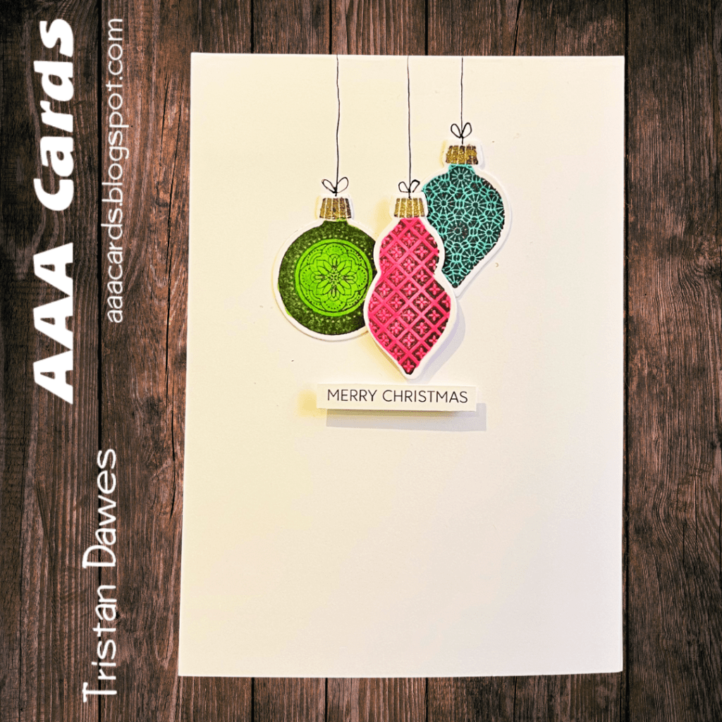 I thought this sketch was perfect for a Christmas card. I stamped three of the baubes from the old Stampin Up “Ornament Keepsake’ stamp set and coloured them with my Stampin Blends in Cucumber Crush, Tahitian Tide and Melon Mambo. I die cut them and popped one up with dimensionals. I added a sentiment from Uniquely Creative.