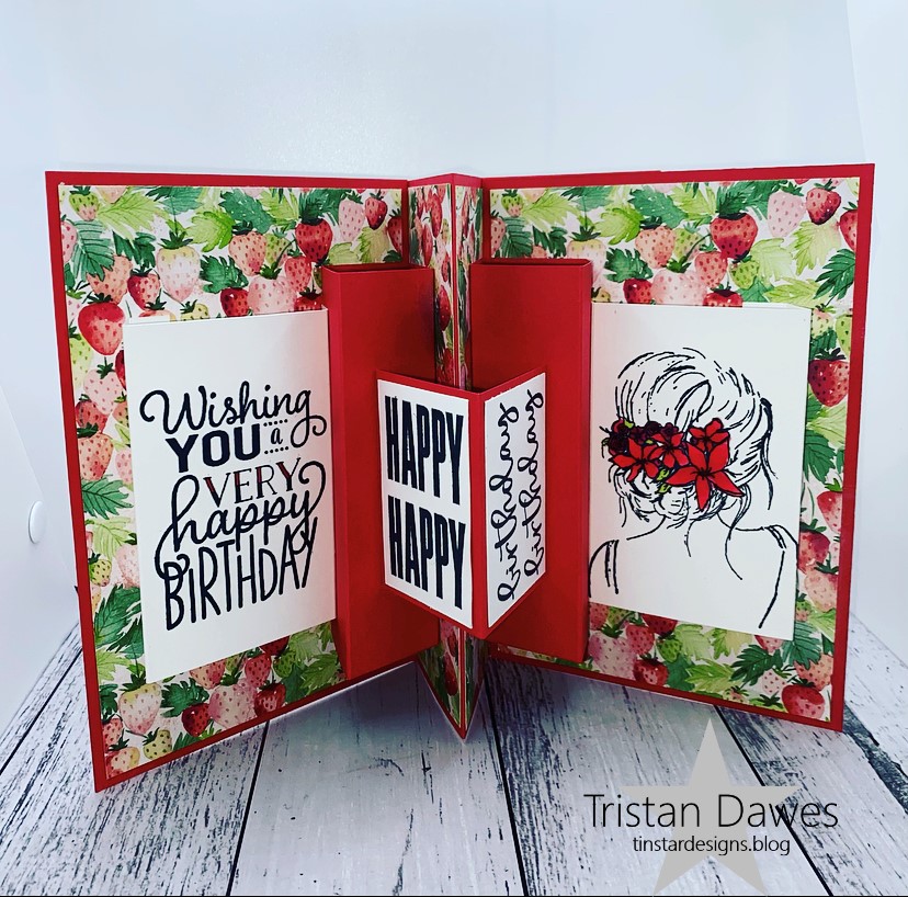 I made a multiple pop out card following a tutorial by Sam Calcott of Mixed Up Craft. I used Stampin Up Berry Delightful DSP and stamps from Stampin Up Big on Birthdays and Biggest Wish, Altenew Precious Peony and Stamps by Me Beautiful Inside & Out.